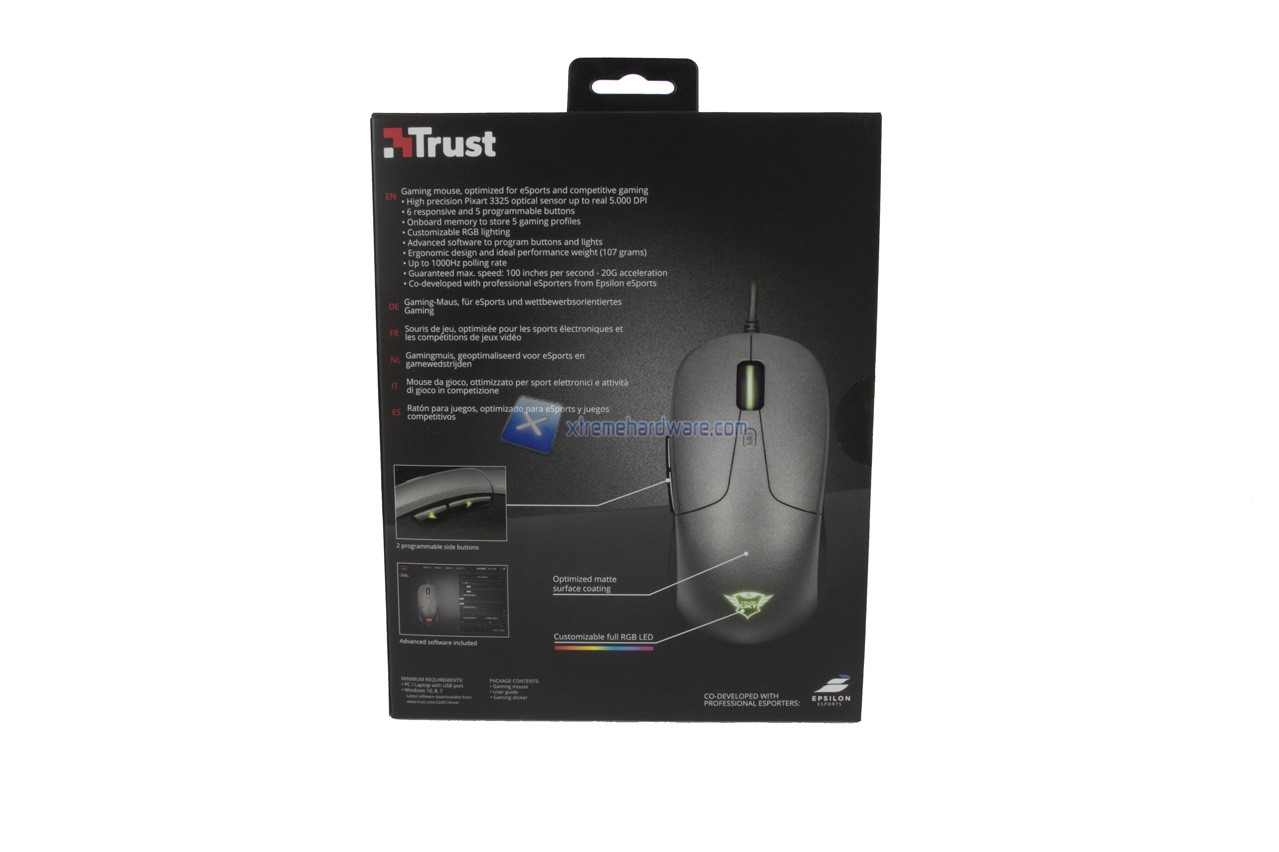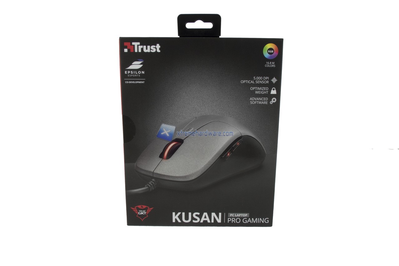 La confezione del Trust GXT 180 Kusan è al solito realizzata in cartone e di media dimensioni. La grafica, parlando della divisione Gaming di Trust, è curata e le informazioni sulla confezione sono curate e adeguate.