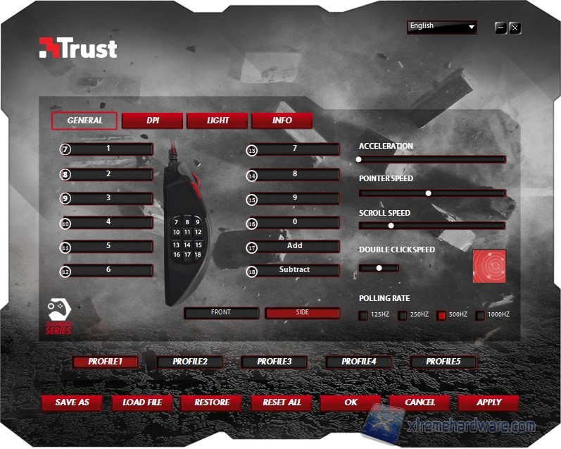 Una volta aperto il software di gestione ci troviamo di fronte il primo Menù “General” relativo alla personalizzazione dei tasti G e non, con relative funzioni o Macro che dovranno essere create tramite l’editor che vedremo dopo. In questo Menù non mancano i settaggi del Polling rate del mouse, dell’accelerazione o ancora del doppio click e così via. Il software di gestione permette con estrema semplicità di creare 5 profili e di personalizzarli in ogni momento. Ricordiamo che i profili verranno salvati immediatamente nella memoria On-Board del mouse. Aggiungiamo che comunque per accedere alla personalizzazione dei 18 tasti G dovremo cliccare sulla tab “Side” che aprirà un nuovo Menù di personalizzazione.