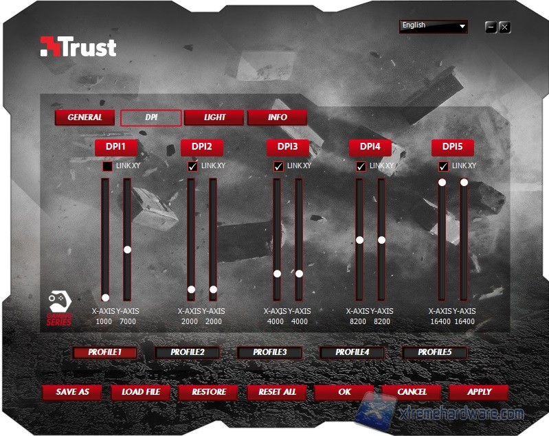 Il Menù successivo è “DPI” ove avremo modo di settare i DPI del nostro mouse da un minimo di 1000 ad un massimo di 16400. Come possiamo notare gli Step dei DPI sono prestabiliti a (1000, 2000, 4000, 8200, 16400dpi) ma tramite un semplice spostamento del cursore vero l’alto o verso il basso potremo passare da 50 a 16400 DPI così da coprire tutte le risoluzioni che un gamer potrebbe richiedere ad un mouse. Inoltre, i DPI permettono l’utilizzo del GXT 166 MMO ad un giocatore sia Low Senser che High Senser. Altra opzione da poter configurare è la regolazione ad assi indipendenti della risoluzione, possibile togliendo la spunta dalla voce “LINK XY”. Sarà quindi possibile settare i DPI dell’asse X o di quello Y a seconda delle nostre necessità.