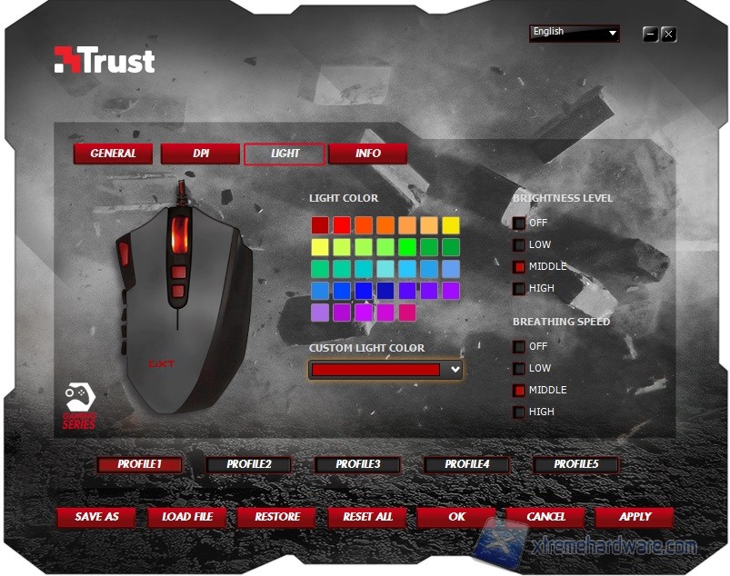 Proseguendo, troviamo il Menù “Light” che come ci fa intuire ci permetterà di variare il colore dell’illuminazione del mouse nonché l’intensità. Avremo modo di variare il colore del logo GXT e quello dei tasti G a seconda dei nostri gusti e degli svariati colori messi a disposizione nel pannello di gestione del mouse. Per rimanere nello stile caratteristico del mouse suggeriamo di settare il colore rosso dato che lo Scroll ha un LED fisso di questo colore che non sarà possibile configurare a piacimento. Ovviamente l’utente potrà comunque decidere quale colore scegliere per il logo GXT e per i tasti secondo i propri gusti personali. Inoltre, vi è la possibilità di modificare l’intensità e la velocità dell’illuminazione tramite vari step che sono OFF, LOW, MIDDLE ed HIGH. Non manca dunque nulla.