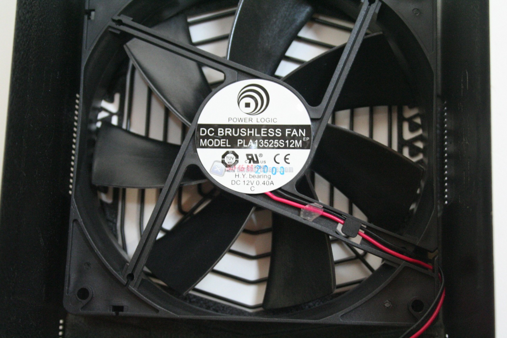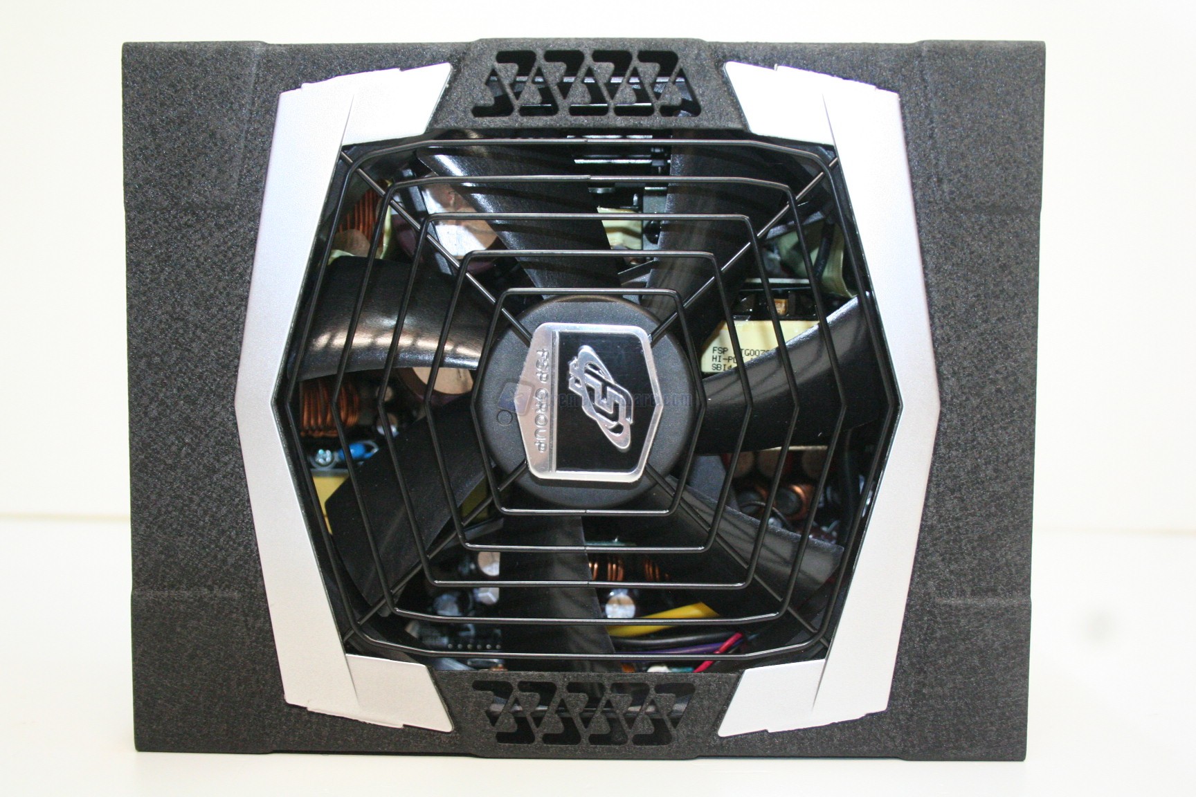 Il design esterno, per quanto stiamo parlando di un alimentatore, è molto curato e si evince la cura per i dettagli. La finitura è proprietaria e rende più difficoltosa la formazione di graffi dovuti al montaggio. Troviamo ovviamente il motivo di dissipazione dei fori "Arrow Flow", proprio della serie AURUM. La ventola, con una griglia superiore, presenta un diametro di 135mm ed un bearing del tipo H.Y. (Hydro, altresì riportato come Fluid Dynamic Bearing F.D.B.), quindi elevata qualità e silenziosità in esercizio. Il seriale della ventola è PLA13525S12M (Power Logic). Il consumo riportato è di circa 0.4 A ed i CFM massimi 111.1, con una rumorosità teorica masima di 41.6 dBA (al massimo del regime di rotazione, che non verrà raggiunto per via dell'ottima termoregolazione).
