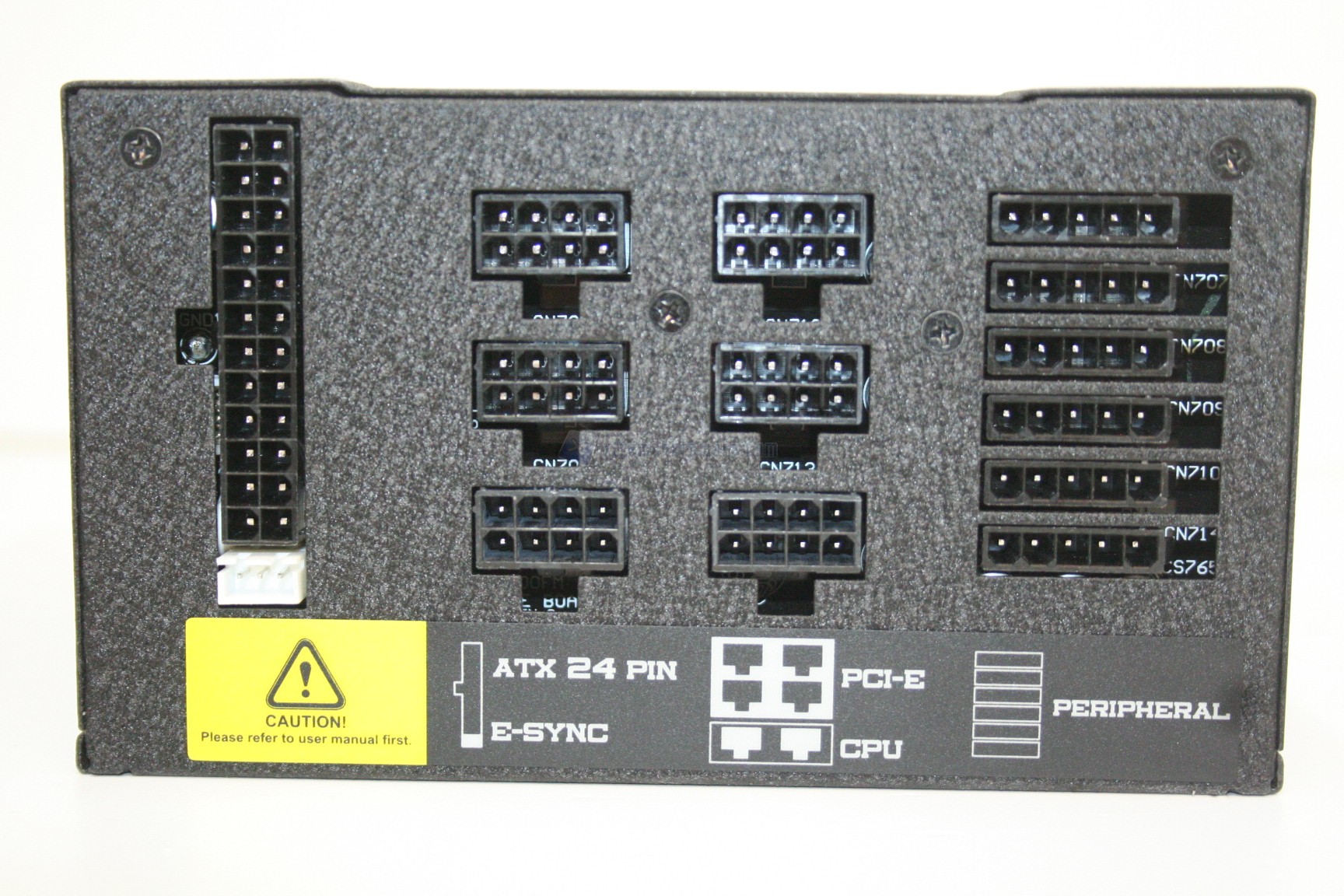 Nella parte anteriore sono posizionate le uscite modulari dell’unità, assieme ad un connettore femmina bianco, che a detta di FSP permetterebbe di aumentare la stabilità diminuendo il ripple. Lo sticker è posto nella parte inferiore, sarebbe stato preferibile nel lato sinistro guardando la PSU dal lato delle connessioni modulari, con la ventola posta in basso.