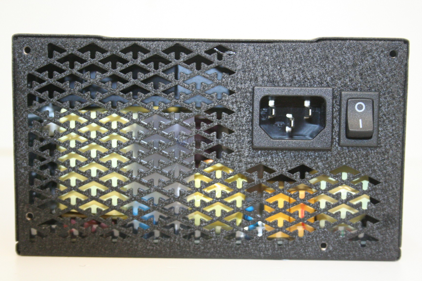 Nel nostro modello non abbiamo trovato lo sticker che segnala la perdita della garanzia, qualora dovesse essere rimosso o forato (per permettere lo smontaggio della scocca, cosa presente nella quasi totalità degli alimentatori attualmente in commercio), ragione per cui probabilmente è una assenza in questo modello. Il pulsante di accensione è di dimensioni standard e la femmina in ingresso è il classico C13, quindi diverso dal C19 della serie AURUM PRO (Gold, della generazione precedente).