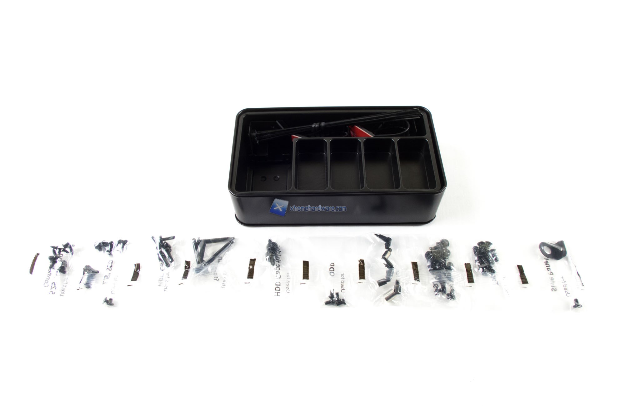 Una volta estratto il tutto dalla confezione passiamo subito ad estrarre il relativo bundle. Cooler Master per questo modello offre a differenza di altri una confezione di latta nella quale sono presenti i set di viti, fascette e il restante.