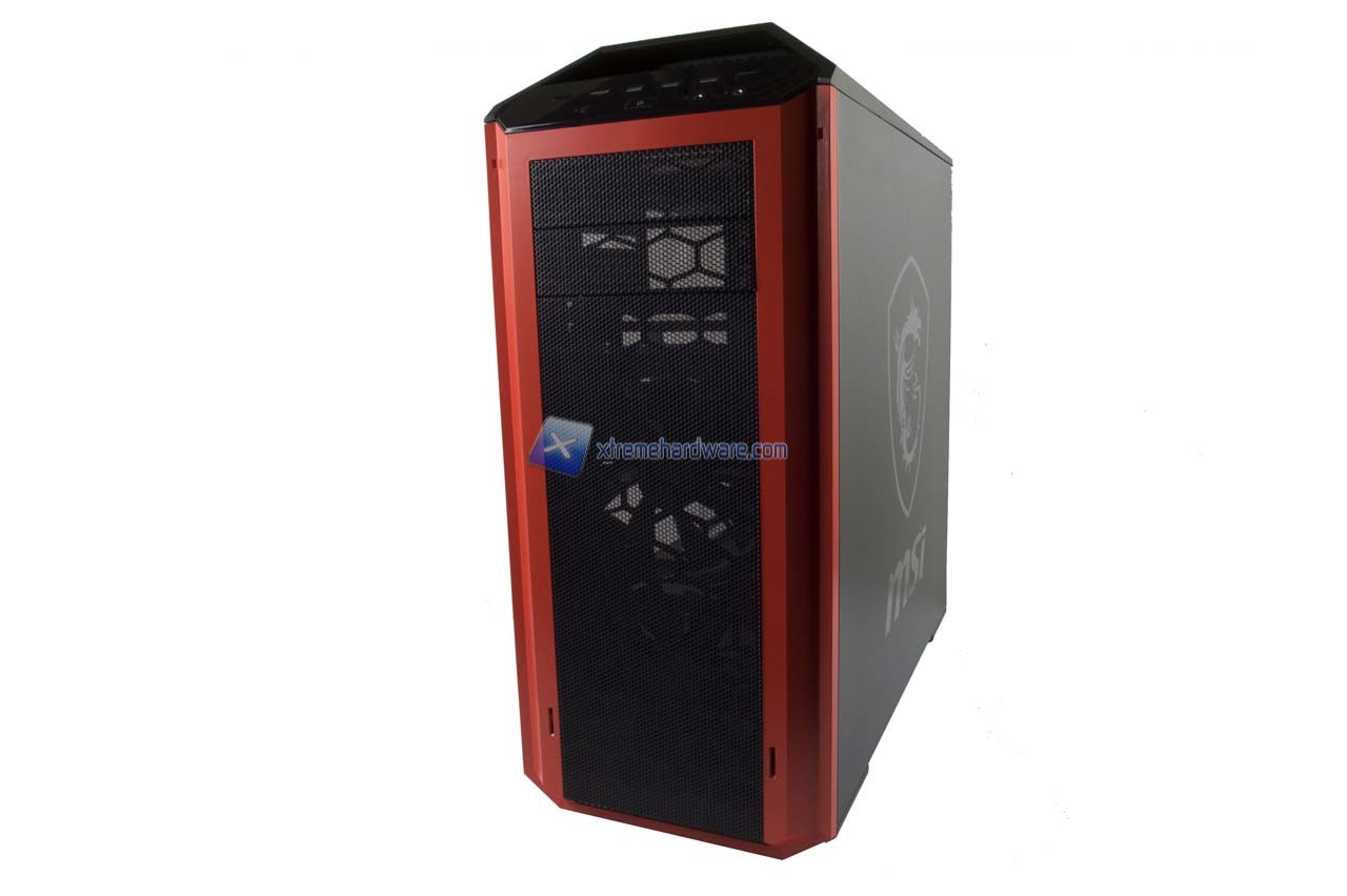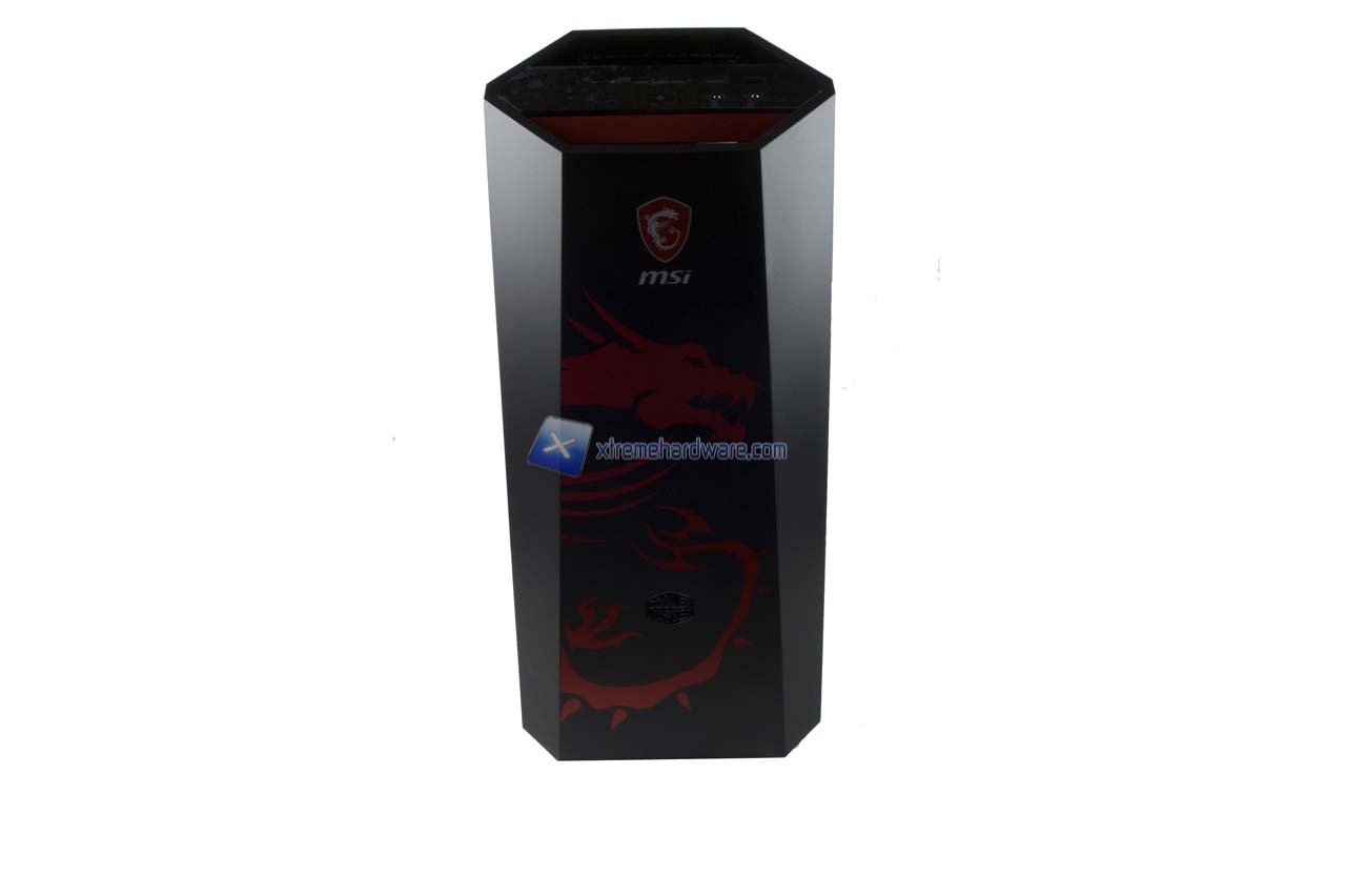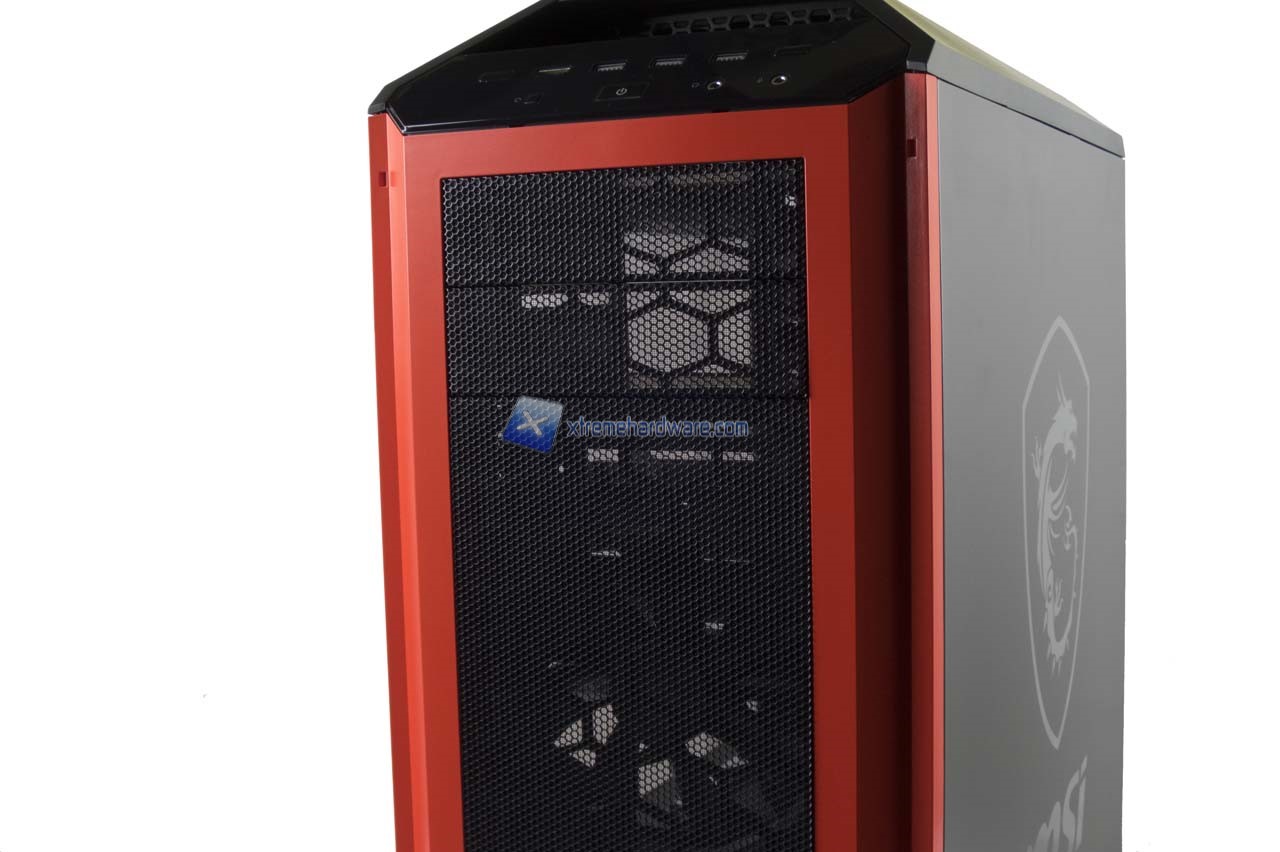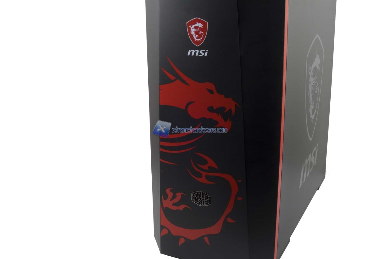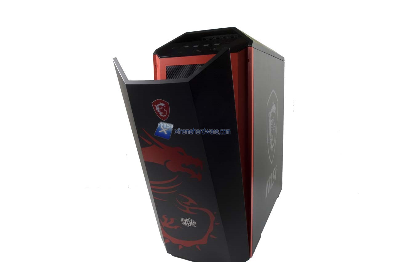 Partendo come di consueto dal pannello frontale possiamo osservare meglio l’immagine logo e relativo badge logo MSI che subito risaltano. Insieme a questi non manca il logo Cooler Master.