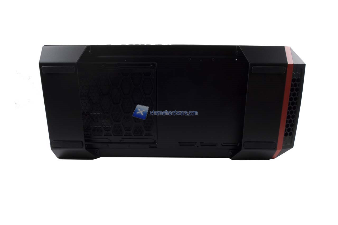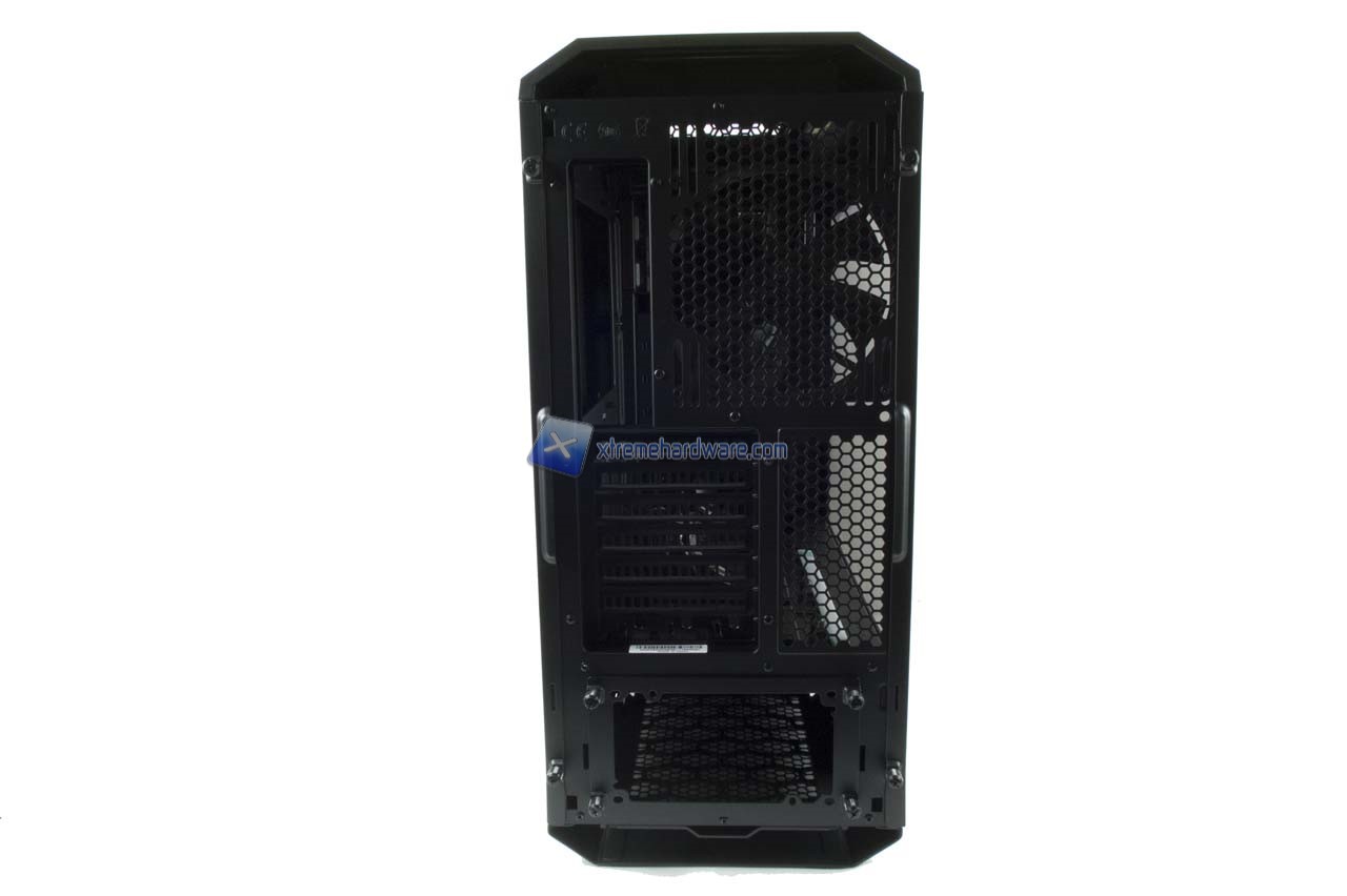 Dal Top passiamo velocemente al retro del case. Immancabile il classico design e Layout che prevede il foro per l’I/O della scheda madre con a lato una griglia in grado di ospitare ventole da 140 mm o da 120 mm. Di default è presente una ventola Cooler Master da 140 mm. Proseguendo troviamo 7 slot PCI-E e infine il foro con supporto Tool-Less per il nostro alimentatore.