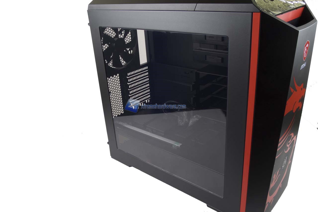 Il lato opposto invece è dotato di un pannello con paratie finestrata in plexyglass per dar modo di scorgere l’intera configurazione Hardware una volta montata oltre alla Barra/Striscia a LED di colore rosso giusto per rimanere in tema Gaming e MSI.