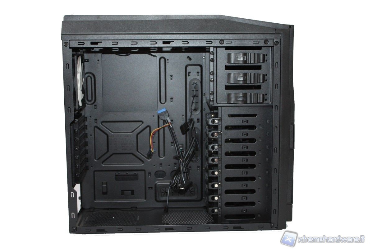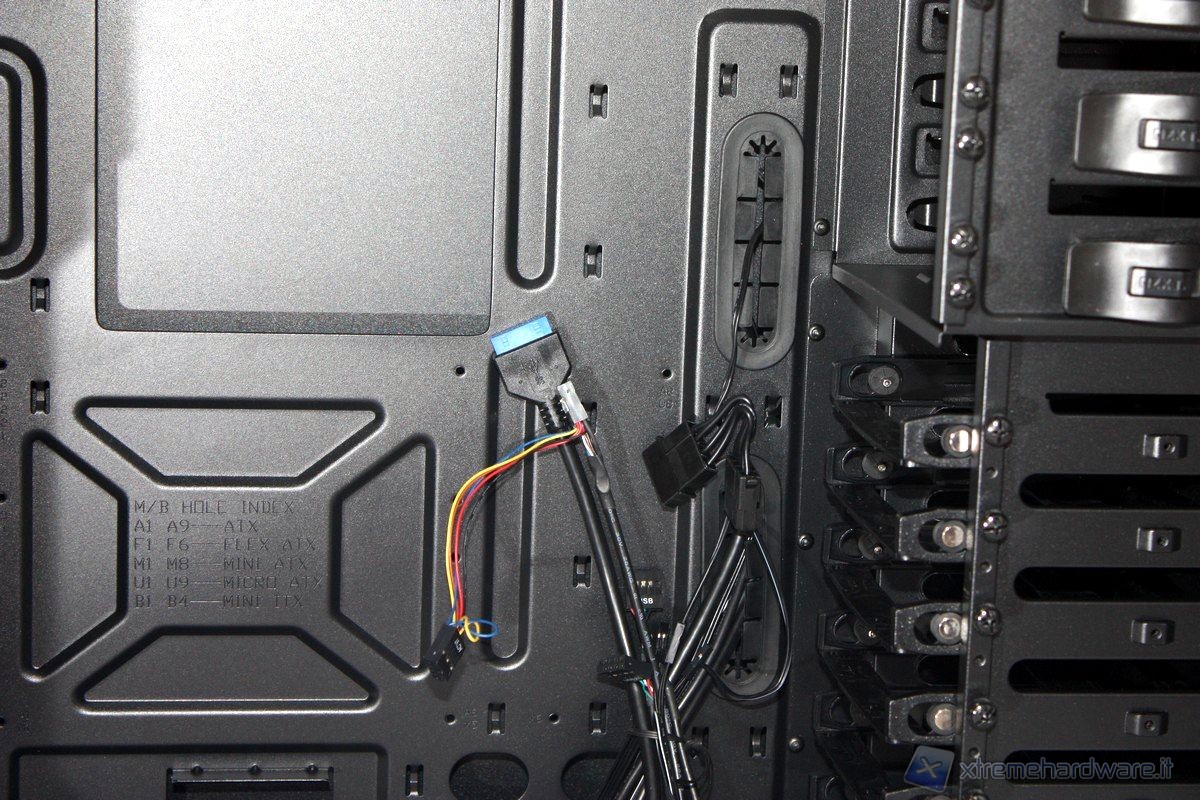 La piastra sulla quale va montata la scheda madre è dotata di un comodo foro in corrispondenza dell'alloggio della CPU per consentire la sostituzione di eventuali dissipatori dotati di backplate, senza dover per forza rimuovere la motherboard dal case stesso. Inoltre sono presenti dei comodissimi fori, dotati di guaina, che garantiscono l'alloggio dei cavi nell'intercapedine tra la paratia laterale del case e la piastra della scheda madre, permettendo così un'organizzazione più pulita all'interno del Tempest 410. I fori non sono però disposti in doppia fila e nel caso di utilizzo di schede madri piuttosto strette, lasceranno scoperti una parte dei cavi, nel tratto tra scheda madre e guaina.