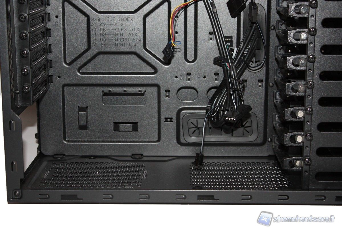 Nella parte inferiore invece troviamo, oltre all'alloggio per il PSU, due comode griglie (di cui solo una dotata di filtro antipolvere rimuovibile dall'esterno per la pulizia), rispettivamente per l'alimentatore e per una eventuale ventola da 120mm.