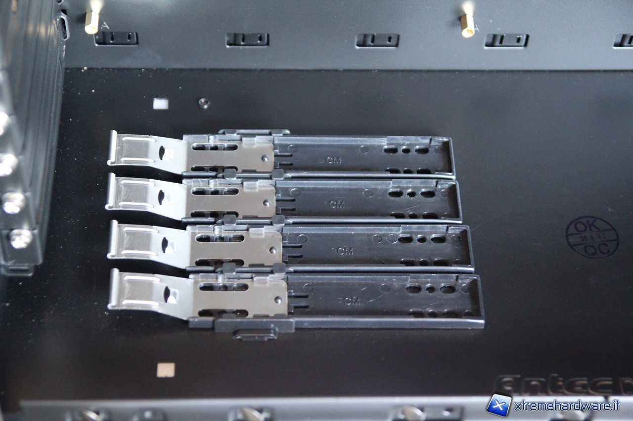 Si notano anche i due vani per il fissaggio di due periferiche da 5.25 pollici mediante le slitte forniteci nel bundle ed il cestello per gli hard disk, dove ricordiamo di poter istallare le periferiche con il classico sistema a "bracket" oppure in sospensione tramite il sistema proprietario Antec.