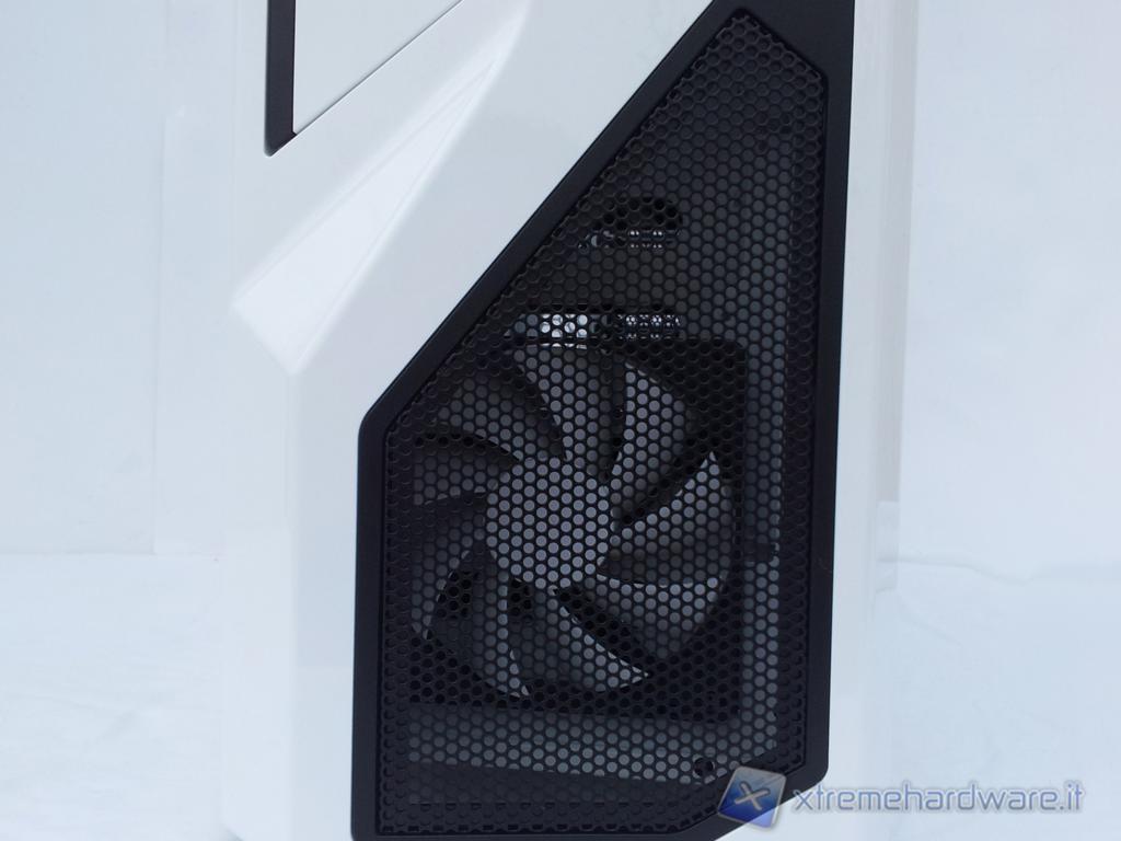 Nella parte frontale bassa è presente un pannello in mesh che, oltre a filtrare la polvere, funge da protezione per la ventola da 120mm, posta tra il pannello frontale stesso e il telaio del case.