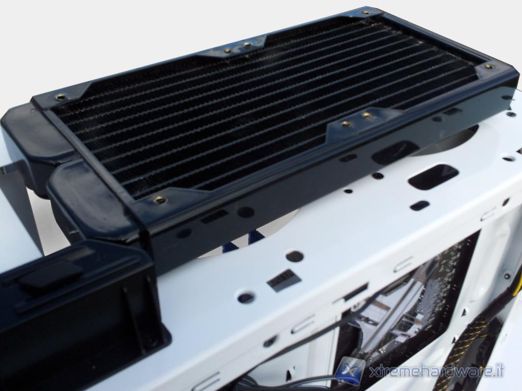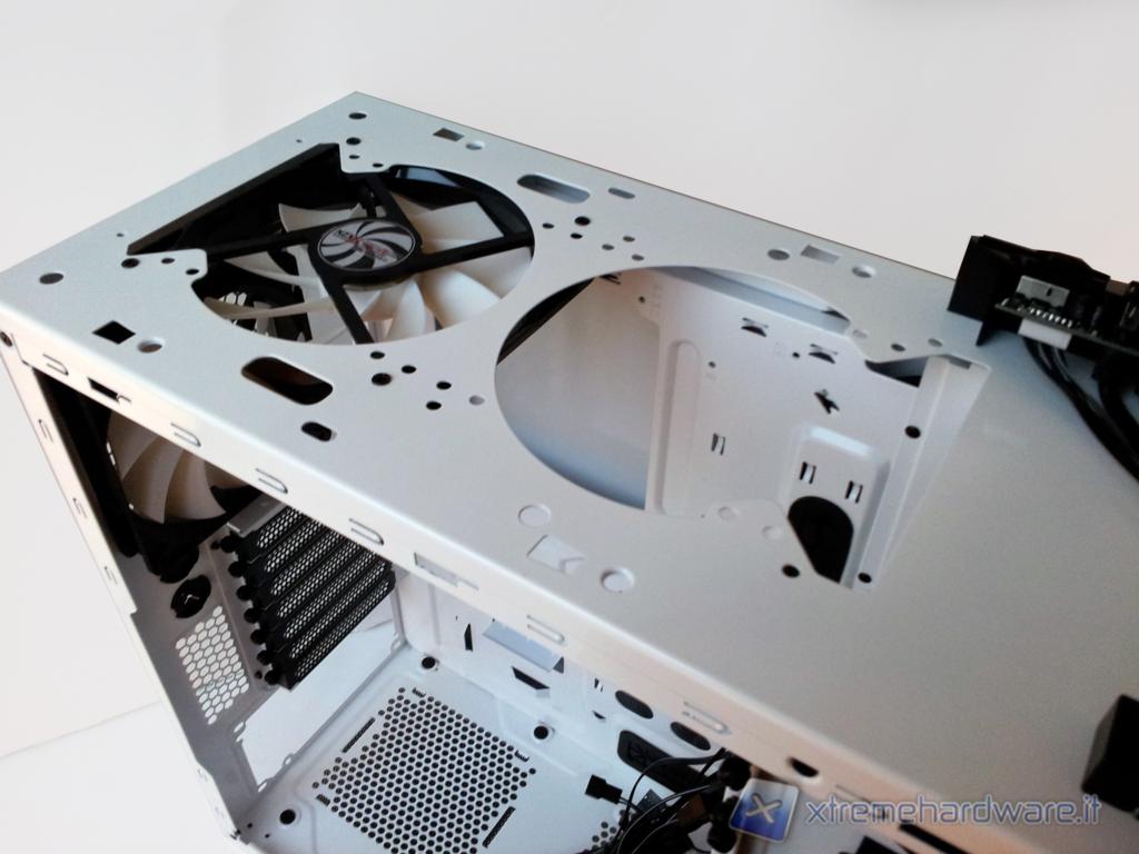 Rimuovendo la cover superiore, possiamo notare un altro importante cambiamento Gli utenti che hanno avuto modo di provare il Phantom in versione Tower avranno sicuramente notato che l'installazione di radiatori 2x120mm sulla parte superiore non era possibile a causa dell'utilizzo di due ventole da 200mm.Nel Phantom 410, invece, si può tranquillamente installare un radiatore 2x120 anche esternamente (verrà successivamente coperto dalla cover in plastica) in quanto la parte superiore del case ha la predisposizione per 2 ventole da 120mm oppure 2 ventole da 140mm. Non sarà possibile montare un radiatore 2x140mm esternamente in quanto si avrebbero problemi per il passaggio dei tubi.