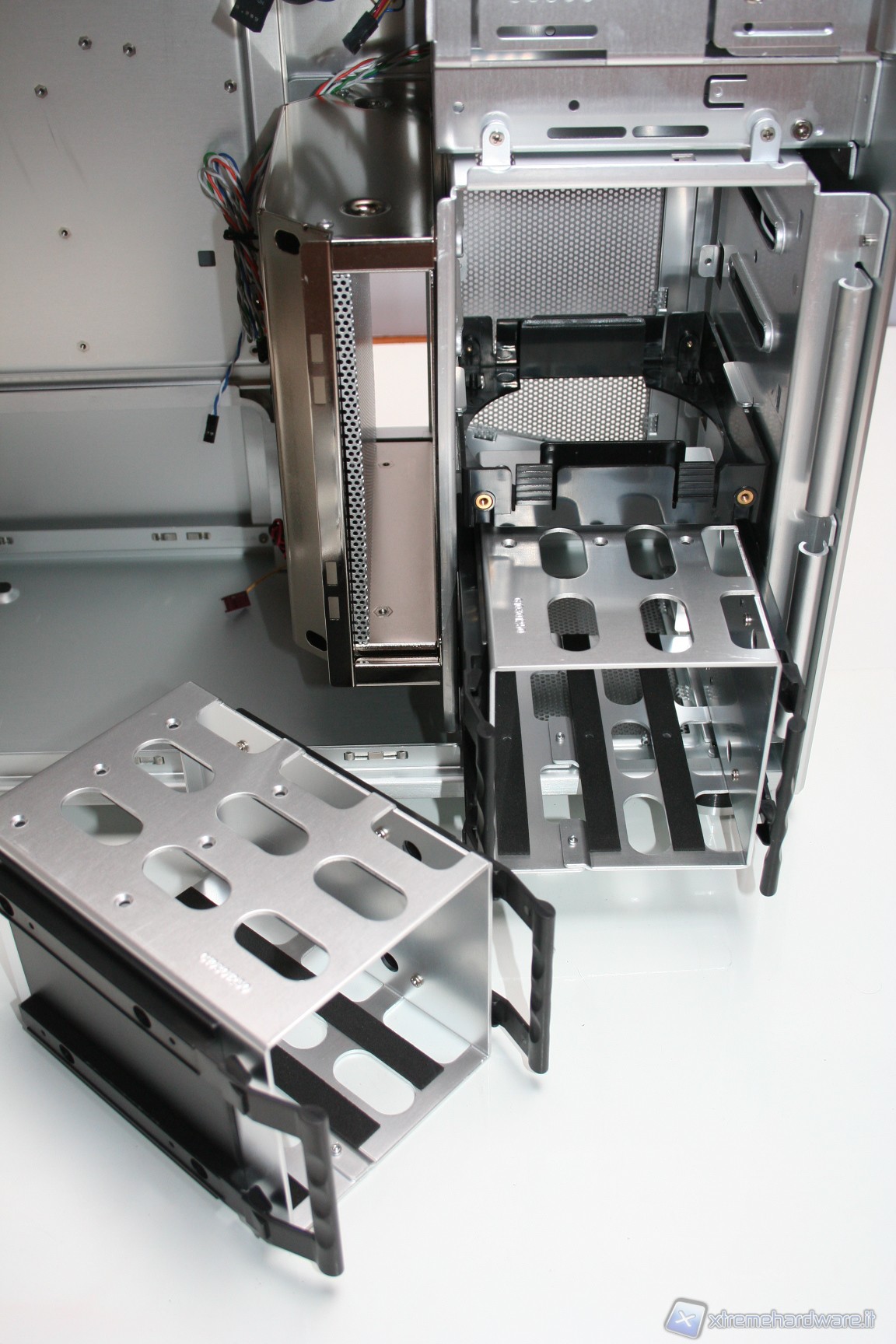 • Un’ottima gestione dei dischi, con sistemi di ritenzione accessibili e funzionali, sistemi di ancoraggio delle unità da 5.25’’ purtroppo non tool-free, ma comunque con strisce anti-vibrazione che ricoprono l’intera superficie di contatto degli hard disk. Sarebbe possibile inserirli senza avvitare ma comunque consigliamo di farlo. Sistema di ancoraggio degli slot di espansione tramite viteria dedicata (aspetto presente anche sugli ultimi modelli silverstone. Riteniamo che debba essere sostituito in favore di un sistema tool-less, che però permetta anche l’installazione di ssd lateralmente)