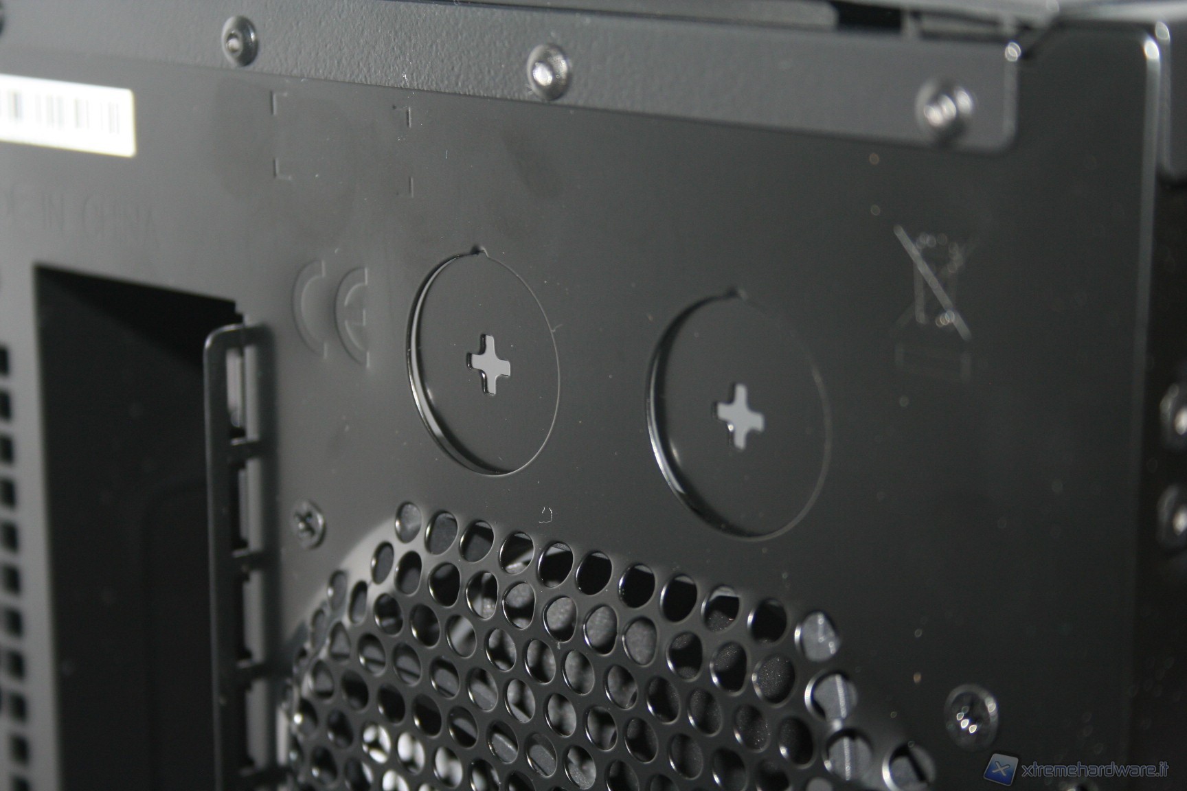 Nella parte superiore è possibile l’intallazione di radiatori sullo stile Corsair H100. C’è da dire che lo spazio tra la fine del PCB della scheda madre ed il termine della ventola superiore non è molto elevato, e questo purtroppo è un fattore presente in molti cabinet Mid-Tower. Ad ogni modo permetterà un’assemblaggio veloce ed immediato, anche con dissipatori ingombranti. Come abbiamo già detto precedentemente, è presente la moderna apertura posteriore, per il cambio del dissipatore e del backplate.