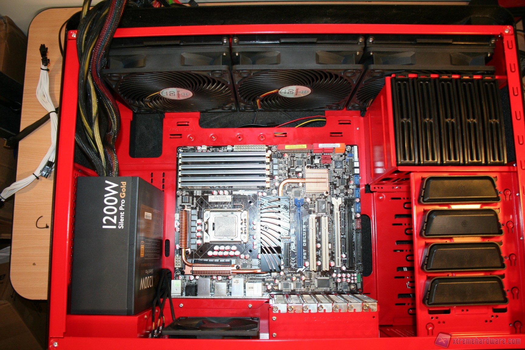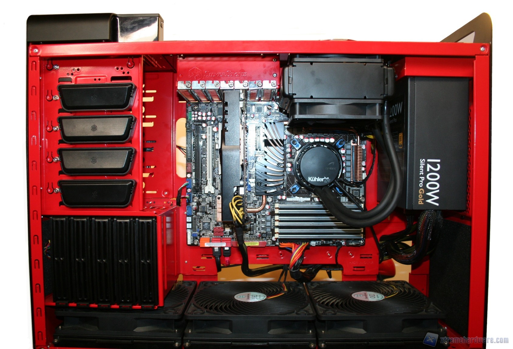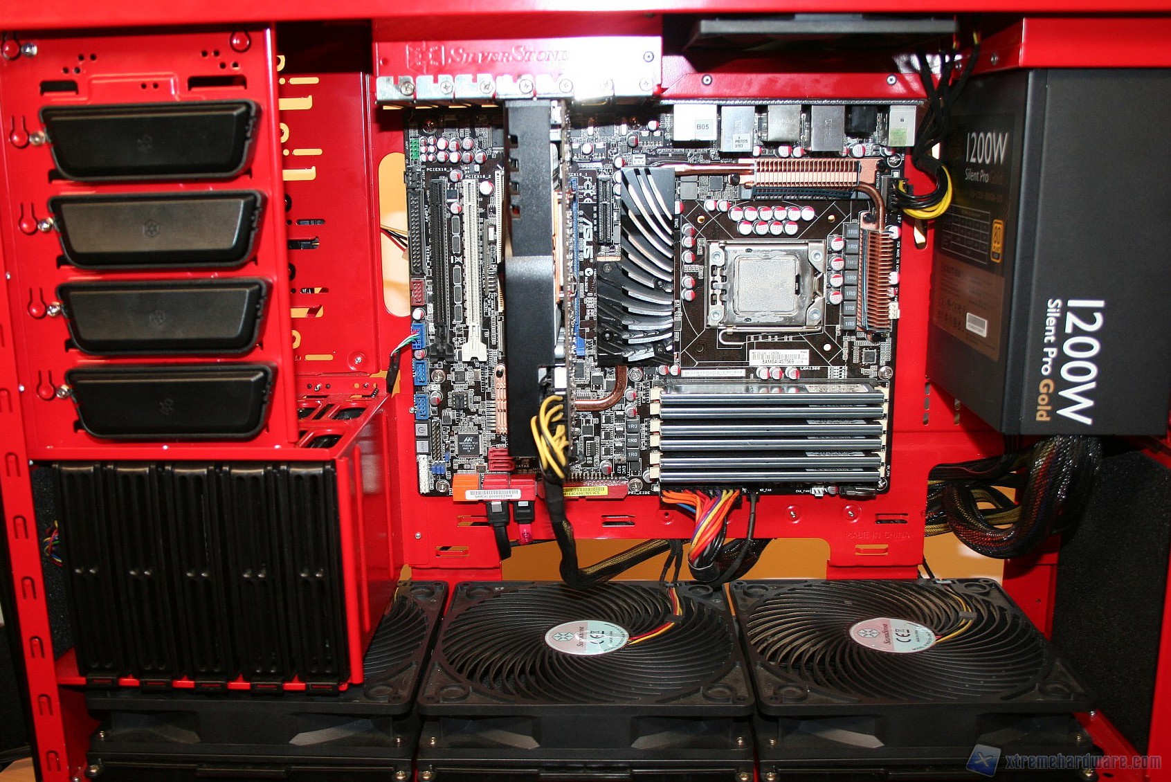 Fatto questo consigliamo l’installazione dei dischi rigidi, facendo attenzione a posizionarli in serie nella struttura predisposta. Fatto questo sarà necessario montare il lettore DVD: dovrete togliere le mascherine frontali e sostituirle con l’unità ottica, per poi riavvitare e serrare lateralmente. Fatto questo, si passerà all’installazione della scheda madre. Se si possiede un dissipatore Intel, tramite il solito sistema push-pin, sarà possibile installarlo successivamente, altrimenti se volete potete già procedere ad installare il backplate del dissipatore della CPU, facendo attenzione a stendere un sottile velo di pasta termica alla base della CPU stessa. In sostanza, se la vostra scheda madre non è mini-ITX, dovrete prima montare i distanziatori nei fori per il formato ATX, serrarli molto bene – consigliamo una pinza larga 1cm durante quest’operazione, su ogni cabinet – e poi apporre la scheda madre, serrandola con le viti fornite nella confezione. Se avete un dissipatore aftermarket potete utilizzare il foro posteriore, che è molto pratico e vi aiuterà non poco all’atto della procedura. Dopo aver montato il dissipatore sulla scheda madre, sarà necessario montare la scheda video, le RAM ed infine procedere all’assemblaggio dei cavi di connessione del cabinet alla scheda madre. Per fare un lavoro pulito consigliamo l’utilizzo delle fascette restringenti fornite in bundle. A titolo informativo riportiamo il cablaggio eseguito posteriormente, ma state certi che con una maggiore cura ed attenzione ai particolari il lavoro sarà ancora migliore. Terminata l’operazione vi consigliamo di connettere tutte le ventole che avete a disposizione. Ecco qui come si presenterà il case a lavoro terminato.