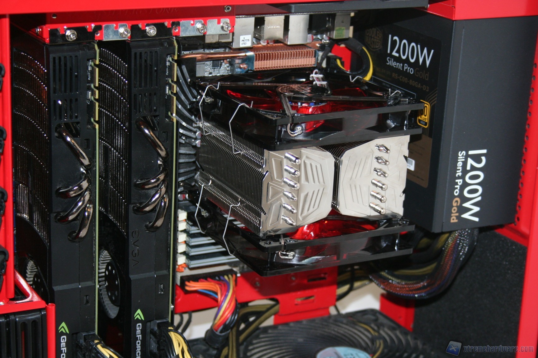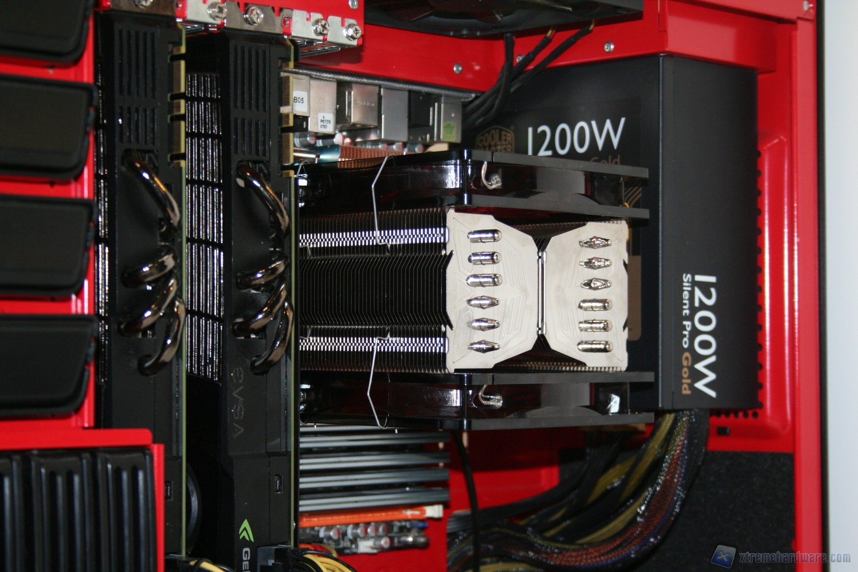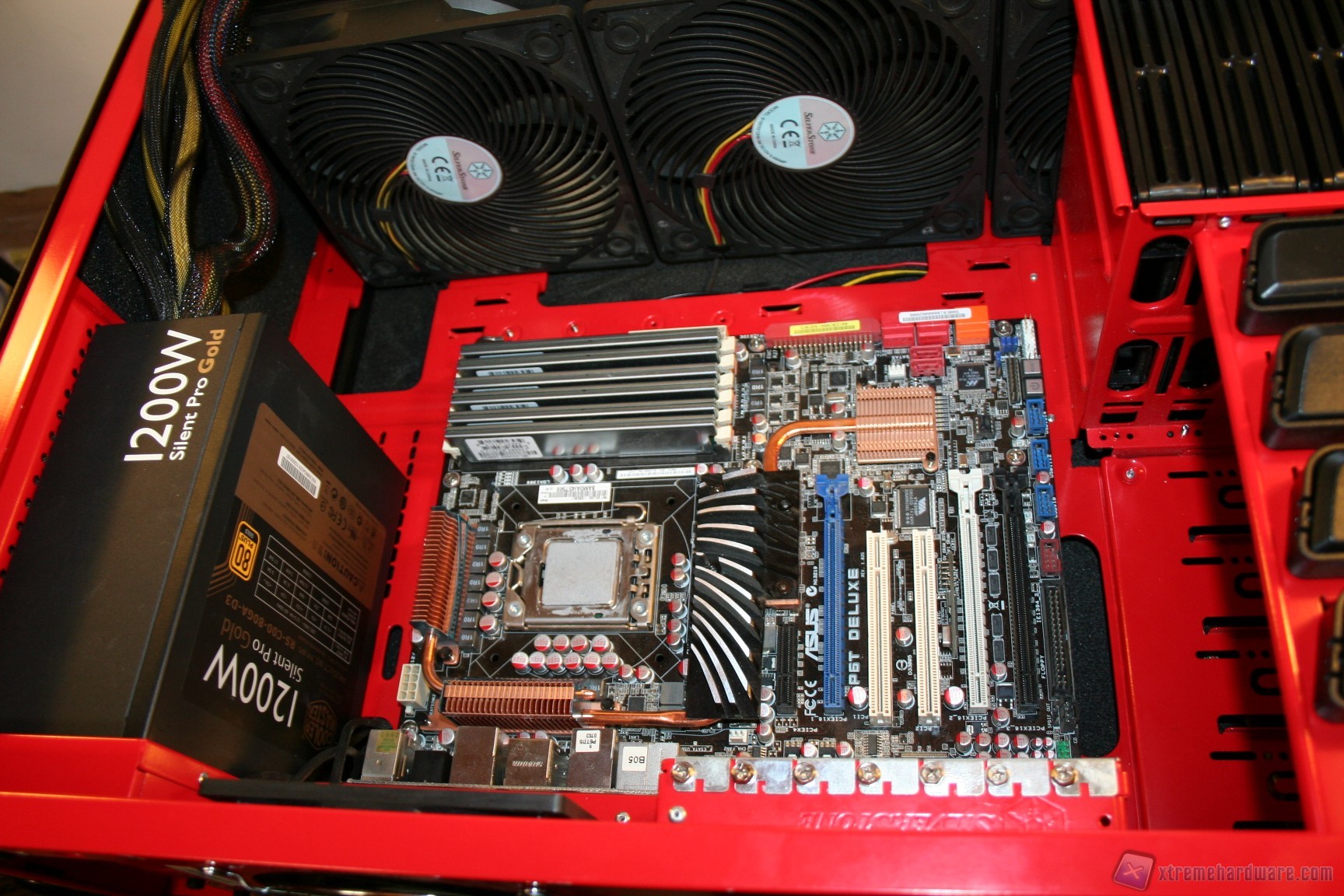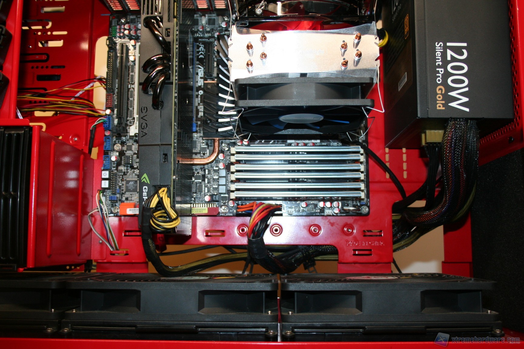 Fatto questo consigliamo l’installazione dei dischi rigidi, facendo attenzione a posizionarli in serie nella struttura predisposta. Fatto questo sarà necessario montare il lettore DVD: dovrete togliere le mascherine frontali e sostituirle con l’unità ottica, per poi riavvitare e serrare lateralmente. Fatto questo, si passerà all’installazione della scheda madre. Se si possiede un dissipatore Intel, tramite il solito sistema push-pin, sarà possibile installarlo successivamente, altrimenti se volete potete già procedere ad installare il backplate del dissipatore della CPU, facendo attenzione a stendere un sottile velo di pasta termica alla base della CPU stessa. In sostanza, se la vostra scheda madre non è mini-ITX, dovrete prima montare i distanziatori nei fori per il formato ATX, serrarli molto bene – consigliamo una pinza larga 1cm durante quest’operazione, su ogni cabinet – e poi apporre la scheda madre, serrandola con le viti fornite nella confezione. Se avete un dissipatore aftermarket potete utilizzare il foro posteriore, che è molto pratico e vi aiuterà non poco all’atto della procedura. Dopo aver montato il dissipatore sulla scheda madre, sarà necessario montare la scheda video, le RAM ed infine procedere all’assemblaggio dei cavi di connessione del cabinet alla scheda madre. Per fare un lavoro pulito consigliamo l’utilizzo delle fascette restringenti fornite in bundle. A titolo informativo riportiamo il cablaggio eseguito posteriormente, ma state certi che con una maggiore cura ed attenzione ai particolari il lavoro sarà ancora migliore. Terminata l’operazione vi consigliamo di connettere tutte le ventole che avete a disposizione. Ecco qui come si presenterà il case a lavoro terminato.