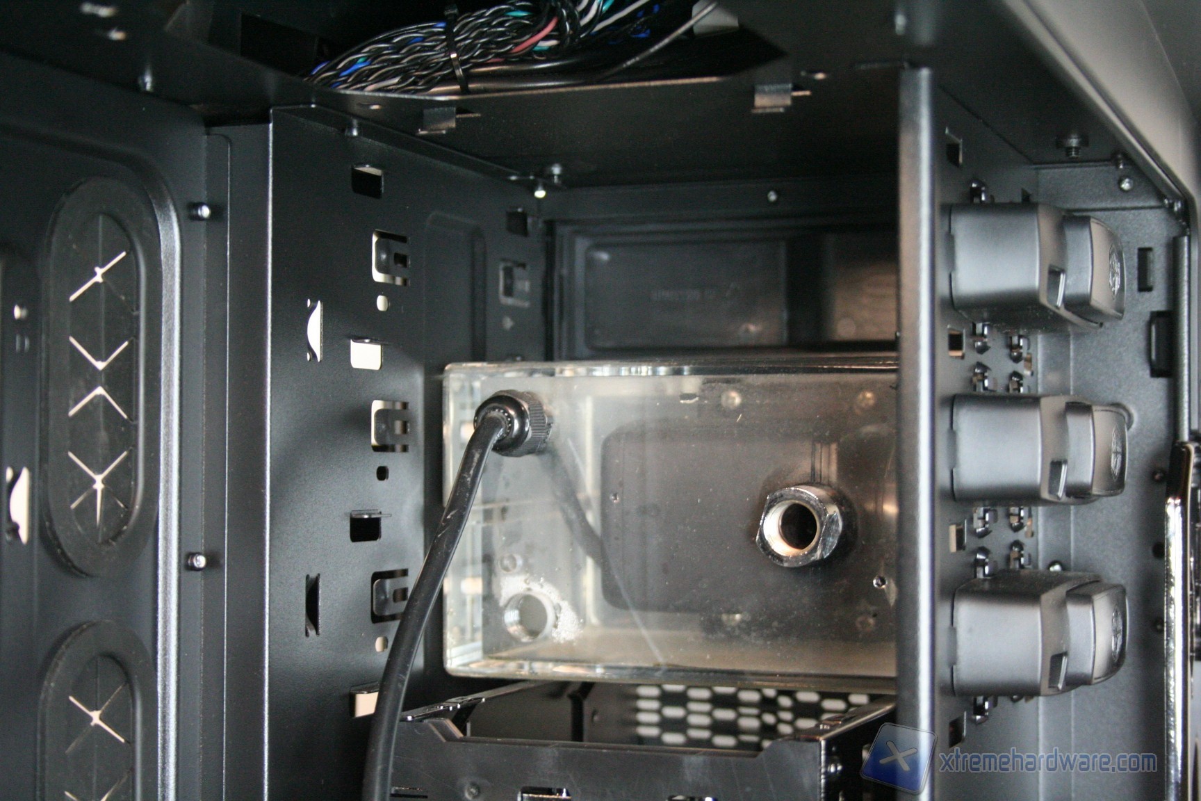 Oltre a questo abbiamo deciso di mostrarvi anche l’integrazione frontale del combo vaschetta e pompa di XSPC. Questa soluzione è a dir poco fantastica in quanto evita alla radice problemi dimensionali, e si integra perfettamente con questo cabinet, sia a livello estetico che pratico. L’installazione, grazie agli ottimi blocchi laterali, ha richiesto 20 secondi! Alcune fotografie dirette, nell’unica posizione in cui è possibile installarla. Fate attenzione alle tubazioni superiori però, e prendete le giuste misure.