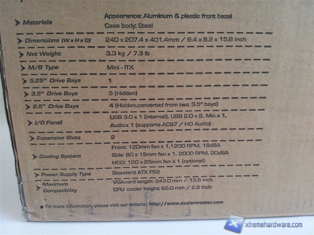 Nella parte posteriore sono riportate, in maniera molto dettagliata, le specifiche tecniche del case che rispecchiano quelle viste precedentemente, sono inoltre presenti i recapiti relativi alle sedi principali Cooler Master nel mondo.