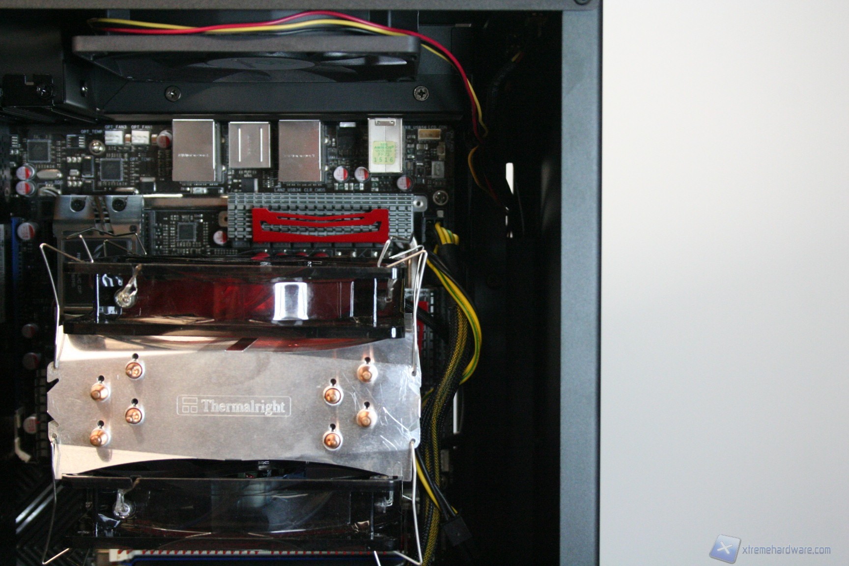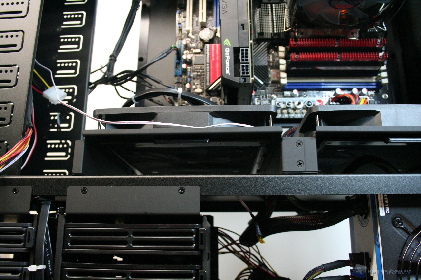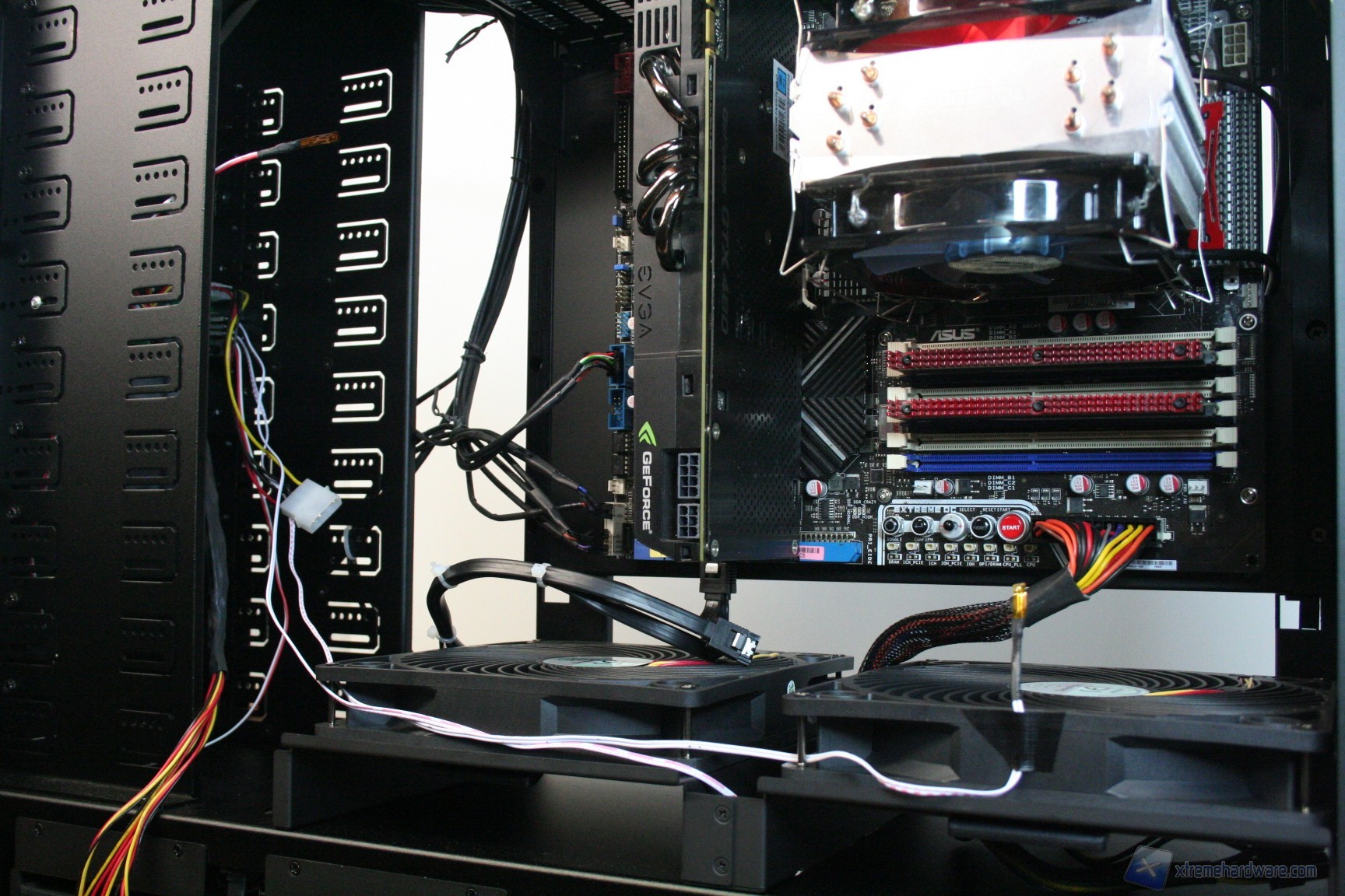 Fatto questo, consigliamo l’installazione dei dischi rigidi, facendo attenzione a posizionarli in serie nella struttura predisposta. Nelle foto precedenti potete osservare la modalità con cui abbiamo cablato i cavi originali, ripartendoli posteriormente dall’alto al basso. Consigliamo di utilizzare lo stesso metodo, per praticità, anche perché nella parte inferiore ci sarà un gran groviglio di connettori molex di alimentazione. Questo sistema andrebbe senza dubbio migliorato, ma il connettore CP06 sopperisce ampiamente a questa mancanza. Sarebbe interessante sfruttare contemporaneamente i connettori CP06 e CP05: probabilmente SilverStone proporrà in futuro una versione unificata. Una volta montati gli hard disk, sarà necessario montare il lettore DVD: dovrete togliere le mascherine frontali e sostituirle con l’unità ottica, per poi riavvitare e serrare lateralmente. Successivamente si passerà all’installazione della scheda madre. Se si possiede un dissipatore Intel, tramite il solito sistema push-pin, sarà possibile installarlo successivamente, altrimenti se volete potete già procedere ad installare il backplate del dissipatore della CPU, facendo attenzione a stendere un sottile velo di pasta termica alla base della CPU stessa. In sostanza, se la vostra scheda madre non è mini-ITX, dovrete prima montare i distanziatori nei fori per il formato ATX, serrarli molto bene – consigliamo una pinza larga 1cm durante quest’operazione, su ogni cabinet – e poi apporre la scheda madre, serrandola con le viti fornite nella confezione. Se avete un dissipatore aftermarket potete utilizzare il foro posteriore, che è molto pratico e vi aiuterà non poco all’atto della procedura. Dopo aver montato il dissipatore sulla scheda madre, sarà necessario montare la scheda video, le RAM ed infine procedere all’assemblaggio dei cavi di connessione del cabinet alla scheda madre. Per fare un lavoro pulito consigliamo l’utilizzo delle fascette restringenti fornite in bundle. Giusto a titolo informativo riportiamo il cablaggio eseguito posteriormente, ma state certi che con una maggiore cura ed attenzione ai particolari il lavoro sarà ancora migliore. Terminata l’operazione vi consigliamo di connettere tutte le ventole che avete a disposizione. Ecco qui come si presenterà il case a lavoro terminato.
