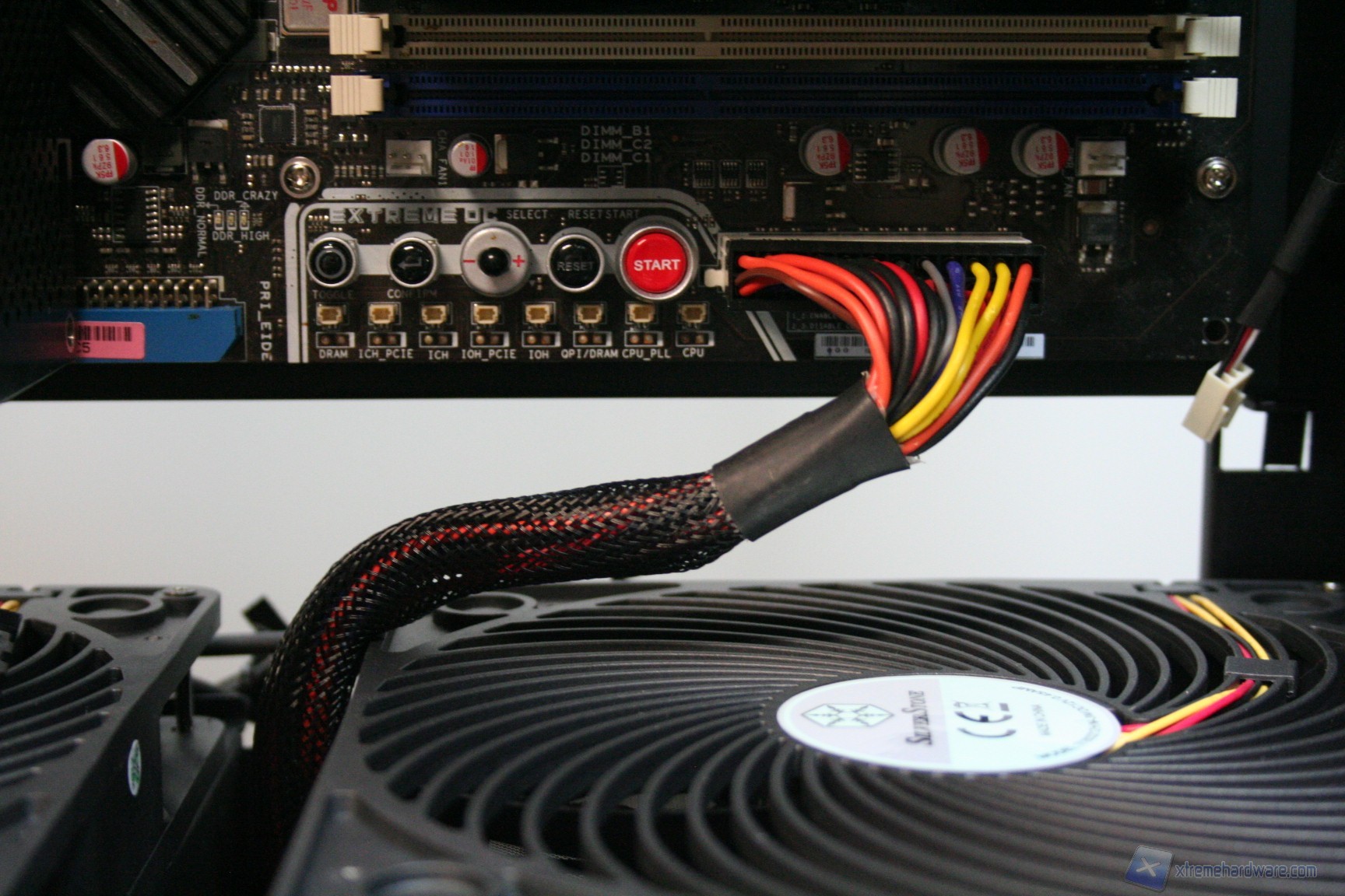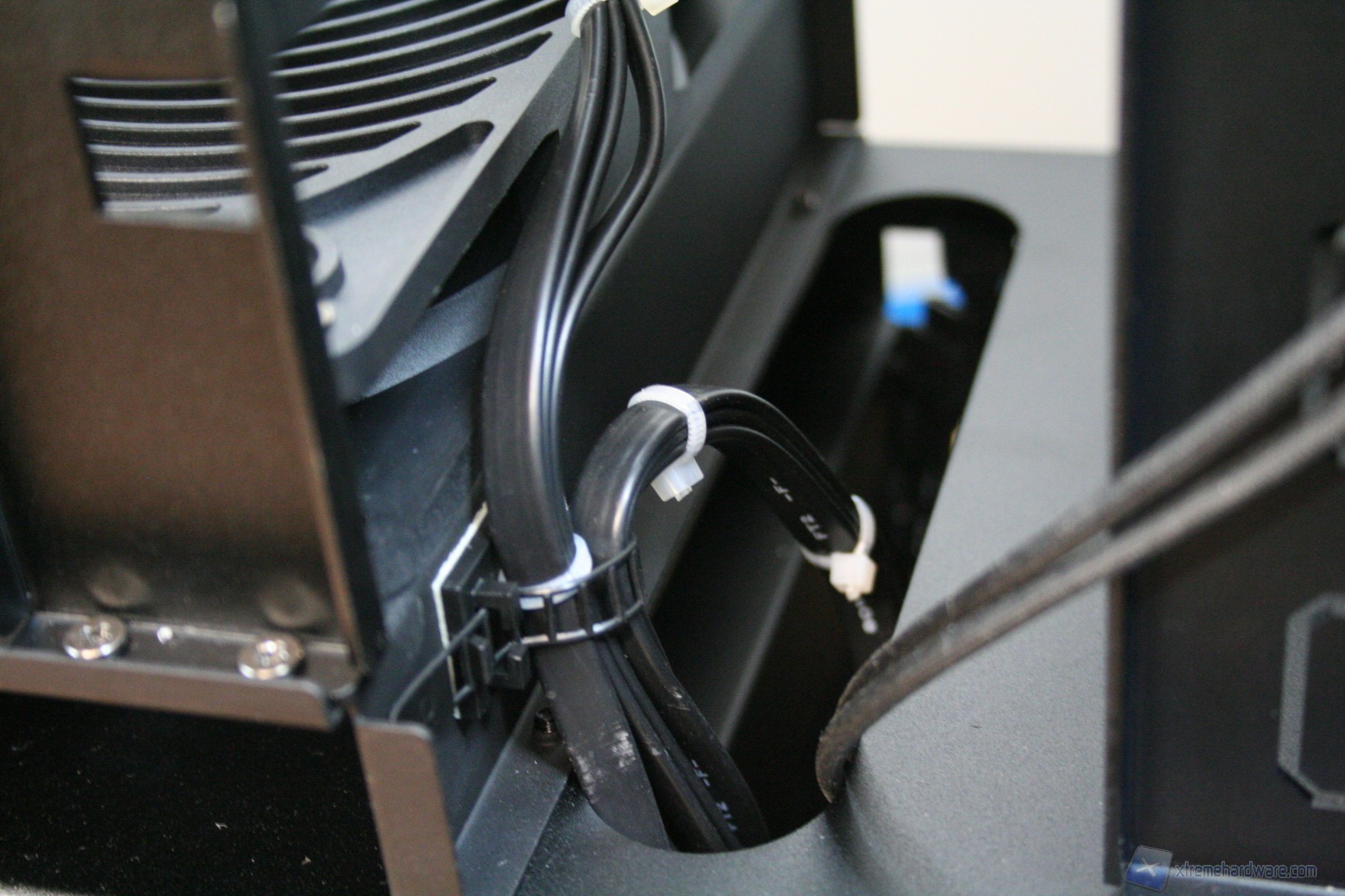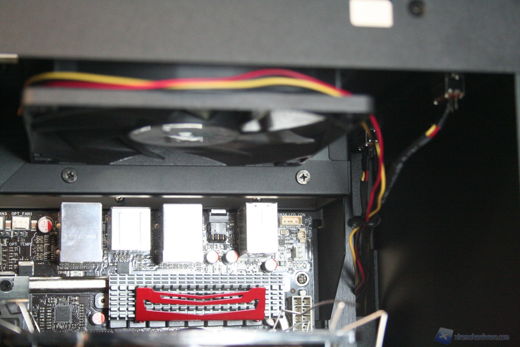 Fatto questo, consigliamo l’installazione dei dischi rigidi, facendo attenzione a posizionarli in serie nella struttura predisposta. Nelle foto precedenti potete osservare la modalità con cui abbiamo cablato i cavi originali, ripartendoli posteriormente dall’alto al basso. Consigliamo di utilizzare lo stesso metodo, per praticità, anche perché nella parte inferiore ci sarà un gran groviglio di connettori molex di alimentazione. Questo sistema andrebbe senza dubbio migliorato, ma il connettore CP06 sopperisce ampiamente a questa mancanza. Sarebbe interessante sfruttare contemporaneamente i connettori CP06 e CP05: probabilmente SilverStone proporrà in futuro una versione unificata. Una volta montati gli hard disk, sarà necessario montare il lettore DVD: dovrete togliere le mascherine frontali e sostituirle con l’unità ottica, per poi riavvitare e serrare lateralmente. Successivamente si passerà all’installazione della scheda madre. Se si possiede un dissipatore Intel, tramite il solito sistema push-pin, sarà possibile installarlo successivamente, altrimenti se volete potete già procedere ad installare il backplate del dissipatore della CPU, facendo attenzione a stendere un sottile velo di pasta termica alla base della CPU stessa. In sostanza, se la vostra scheda madre non è mini-ITX, dovrete prima montare i distanziatori nei fori per il formato ATX, serrarli molto bene – consigliamo una pinza larga 1cm durante quest’operazione, su ogni cabinet – e poi apporre la scheda madre, serrandola con le viti fornite nella confezione. Se avete un dissipatore aftermarket potete utilizzare il foro posteriore, che è molto pratico e vi aiuterà non poco all’atto della procedura. Dopo aver montato il dissipatore sulla scheda madre, sarà necessario montare la scheda video, le RAM ed infine procedere all’assemblaggio dei cavi di connessione del cabinet alla scheda madre. Per fare un lavoro pulito consigliamo l’utilizzo delle fascette restringenti fornite in bundle. Giusto a titolo informativo riportiamo il cablaggio eseguito posteriormente, ma state certi che con una maggiore cura ed attenzione ai particolari il lavoro sarà ancora migliore. Terminata l’operazione vi consigliamo di connettere tutte le ventole che avete a disposizione. Ecco qui come si presenterà il case a lavoro terminato.