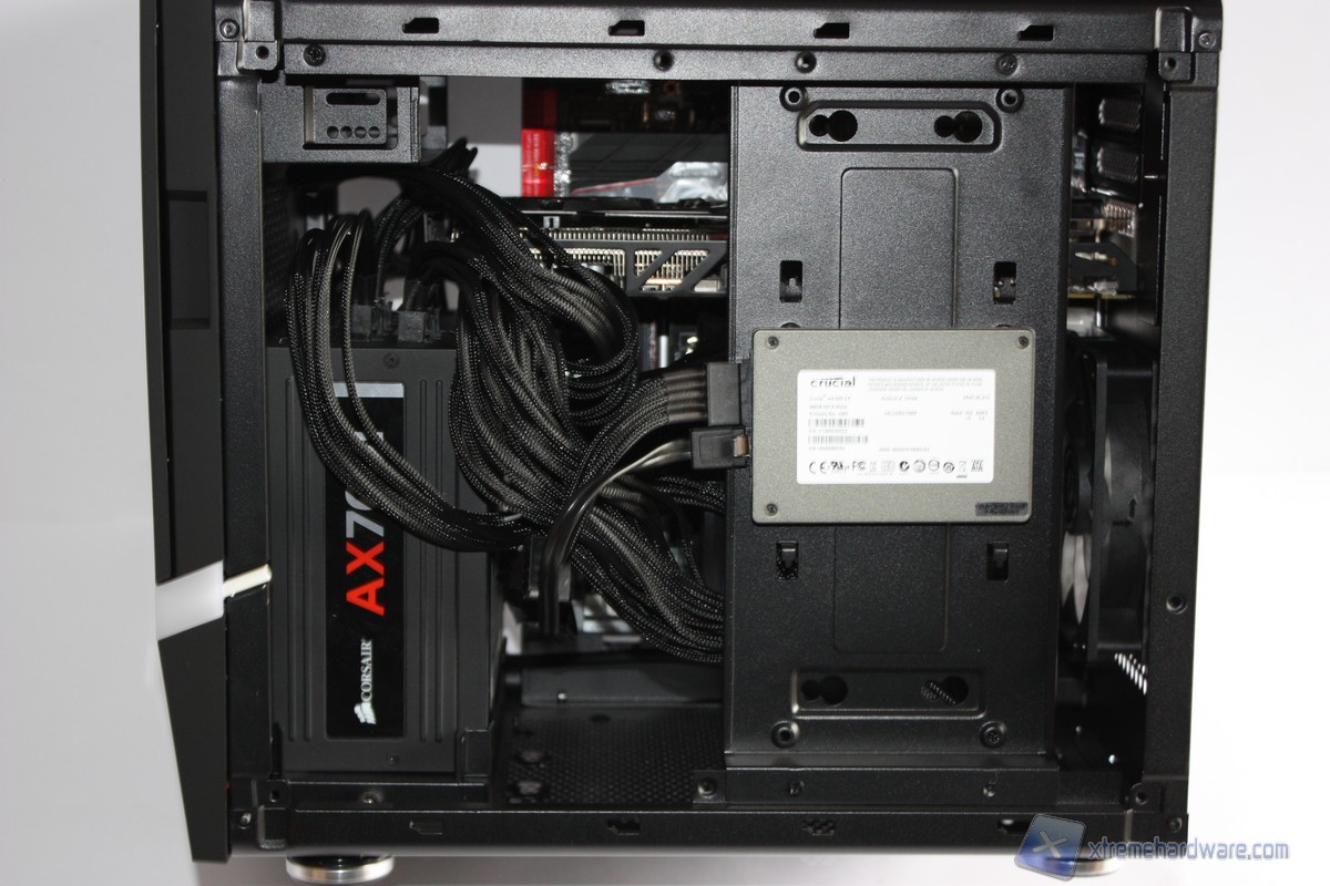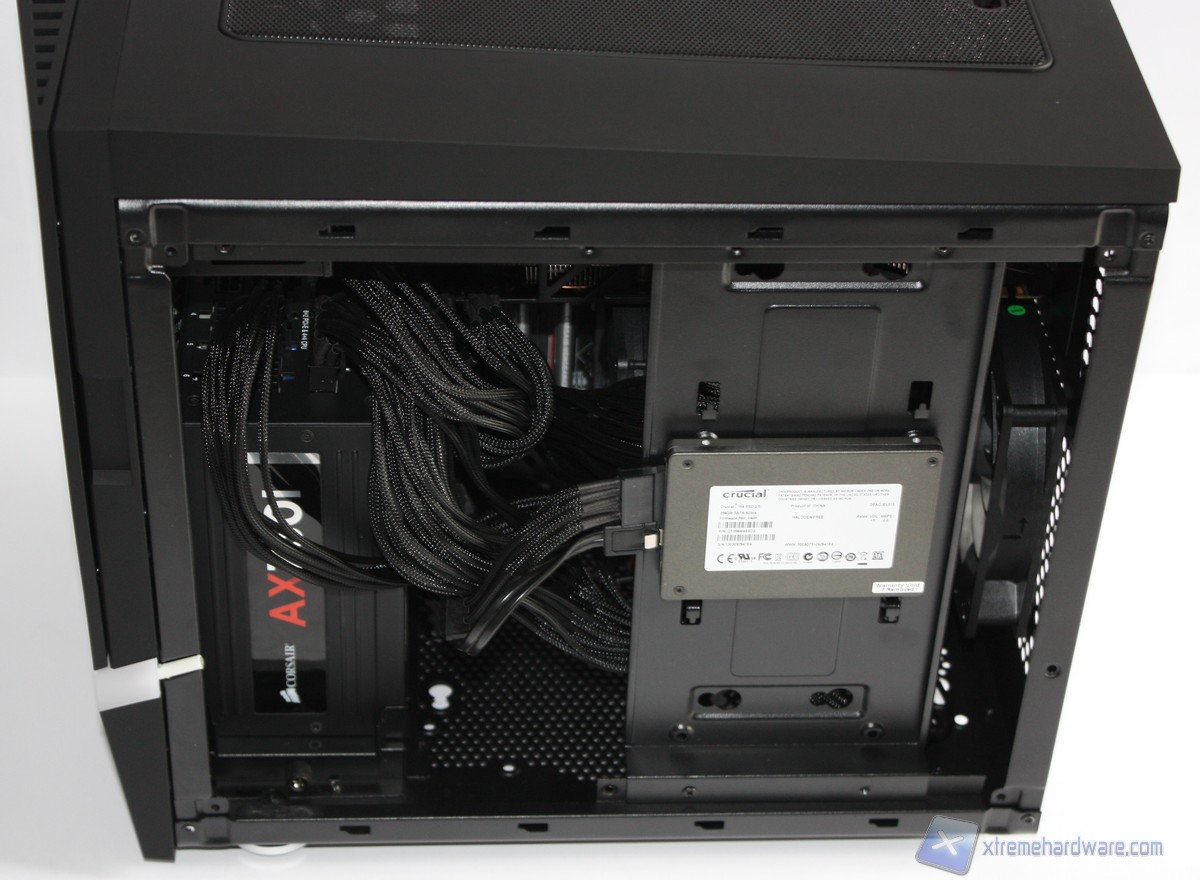 In questo paragrafo analizzeremo velocemente il montaggio di un sistema Intel ed il conseguente cablaggio posteriore ed anteriore. Anche per gli utenti poco esperti la procedura è molto facile: per prima cosa dovrete montare l’alimentatore alla base del cabinet, facendo attenzione a passare il connettore di alimentazione della scheda madre attraverso il retro del case insieme anche a quello ausiliario EPS ad 8pin. Nel caso il nostro alimentatore non abbia cavi abbastanza lunghi possiamo optare sempre per delle prolunghe. Fatto questo, consigliamo l’installazione della scheda madre con relativo dissipatore montato e successivamente della scheda video. Successivamente installiamo il plate con gli SSD o l’Hard Disk montato e provvediamo ad avvitare tale plate ai fori posti in alto ed in basso della parte laterale. Sarà quindi necessario montare il lettore ottico/fan controller, qualora presente: dovrete togliere una mascherina frontale dall’interno.