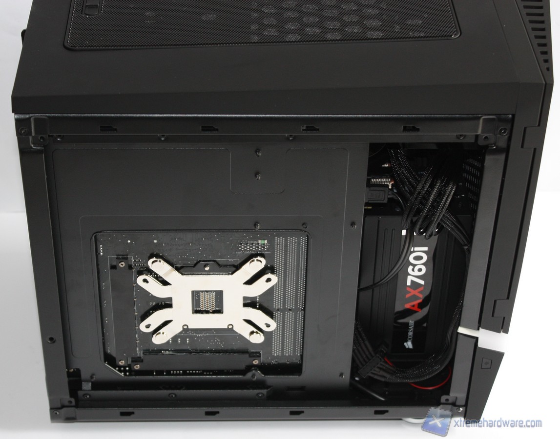 Se si possiede un dissipatore Intel, tramite il solito sistema Push-Pin, sarà possibile installarlo successivamente, altrimenti se volete potete già procedere ad installare il backplate del dissipatore della CPU, facendo attenzione a stendere un sottile velo di pasta termica alla base della CPU stessa. In sostanza, se la vostra scheda madre non è mini-ITX, dovrete prima montare i distanziatori nei fori per il formato Micro ATX, serrarli molto bene – consigliamo una pinza larga 1cm durante quest’operazione, su ogni cabinet – e poi apporre la scheda madre, serrandola con le viti fornite nella confezione. Se avete un dissipatore aftermarket potete utilizzare il foro posteriore, che è molto pratico date le generosissime dimensioni; foro che vi aiuterà non poco all’atto della procedura. Dopo aver montato il dissipatore sulla scheda madre, sarà necessario montare la scheda video, le RAM ed infine procedere all’assemblaggio dei cavi di connessione del cabinet alla scheda madre.