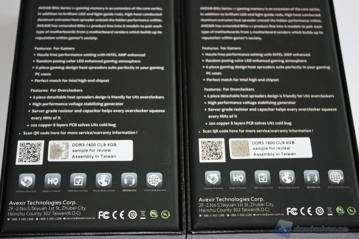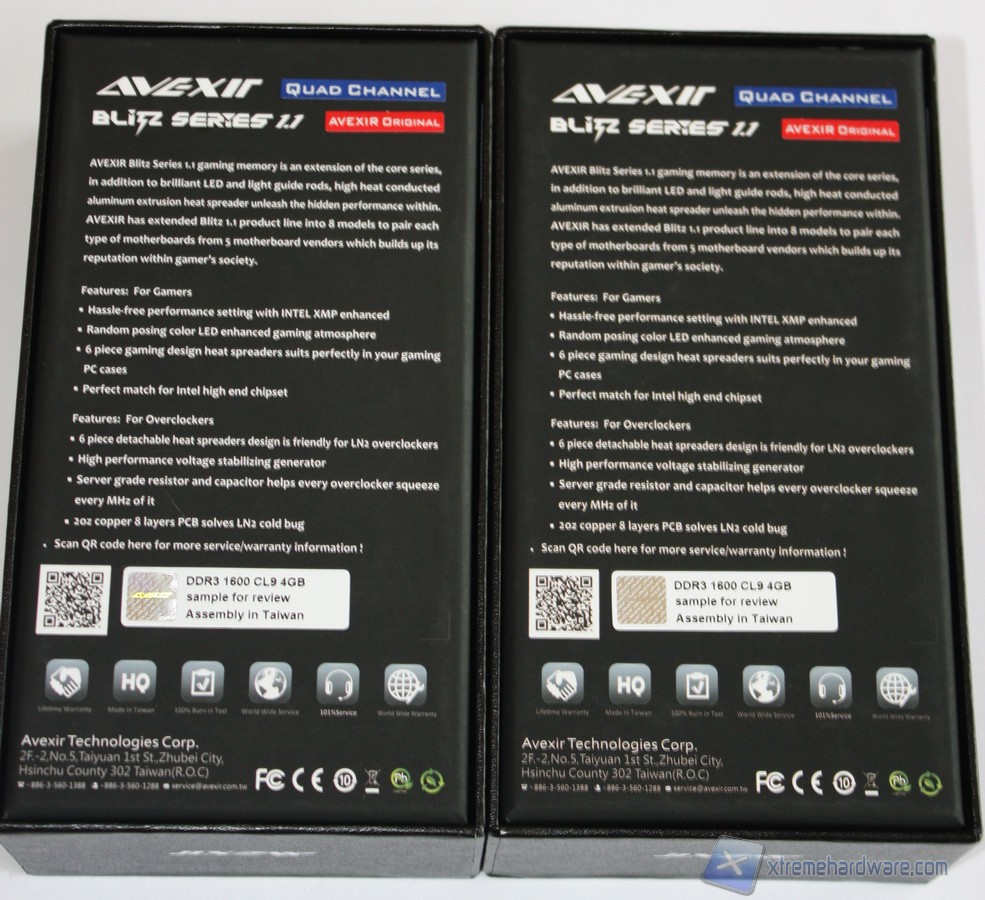 Nel retro della confezione sono presenti ulteriori informazioni quali una breve descrizione della serie Blitz, le caratteristiche principali, ulteriori informazioni sull’azienda e riferimenti ad essa e non da meno un adesivo che riporta il modello ed il taglio dei moduli RAM scelti oltre che un ologramma che certifica la genuinità del prodotto Avexir.