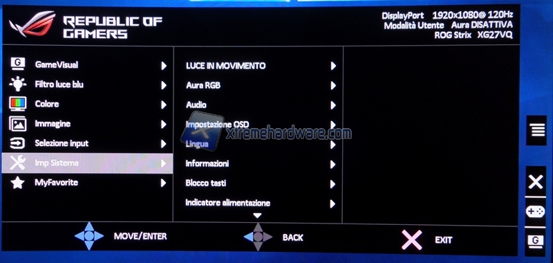 La maggior parte delle funzioni risulta piuttosto intuitiva anche solo dalle immagini. Precisiamo solo che sotto la voce Immagine sarà possibile regolare l’azione dell’overdrive (sei livelli, da zero a cinque) attivare/disattivare la funzione FreeSync e l’ELMB (Extreme Low Motion Blur). Quest’ultime due si escludono a vicenda. La tecnologia di sincronia funziona in un range che va da 48 a 144 Hz, mentre l’ELMB (che inserisce un frame nero tra l’uno e l’altro, diminuendo l’effetto scia) funziona al massimo a 120 Hz.