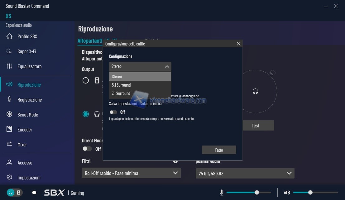 Si parte da ‘’Profilo SBX’’ dove troviamo una lista di diversi profili precaricati. Profili che potranno essere scelti dal Menu a tendina a tramite scorrimento laterale con le frecce. Oltre i classici di default sono presenti anche diversi giochi tra i più famosi. Ogni profilo mette a disposizione poco più sotto alcune voci che sono ‘’Surround’’, ‘’Crystalizer’’, ‘’Bassi’’, ‘’Smart Vol’’ e infine ‘’Dialog+’’ che potranno essere eventualmente personalizzati nel caso il Preset di base per quel Profilo non sia di vostro gradimento. Avrete inoltre massima libertà di personalizzazione con cui editare suddetti profili. Creazione, cancellazione, salvataggio.