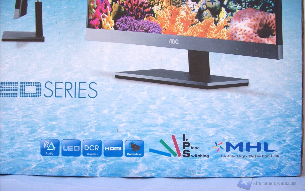 La confezione dell’AOC i2757Fm vuole subito porre all’attenzione dell’acquirente il design sottile del pannello e la possibilità di poter appoggiare il monitor sul piano di lavoro, in modalità dual stand, ovvero senza l’utilizzo della base. Facente parte della serie 57LED, vengono riportate alcune caratteristiche principali come la presenza degli speaker audio, la retroilluminazione a LED, Dynamic Contrast Ratio di 20M:1, porta HDMI, design borderless, pannello a matrice IPS e supporto alla porta MHL (Mobile High-Definition Link). È presente anche l’award conferitogli per il prestigioso premio iF Design Award 2012.