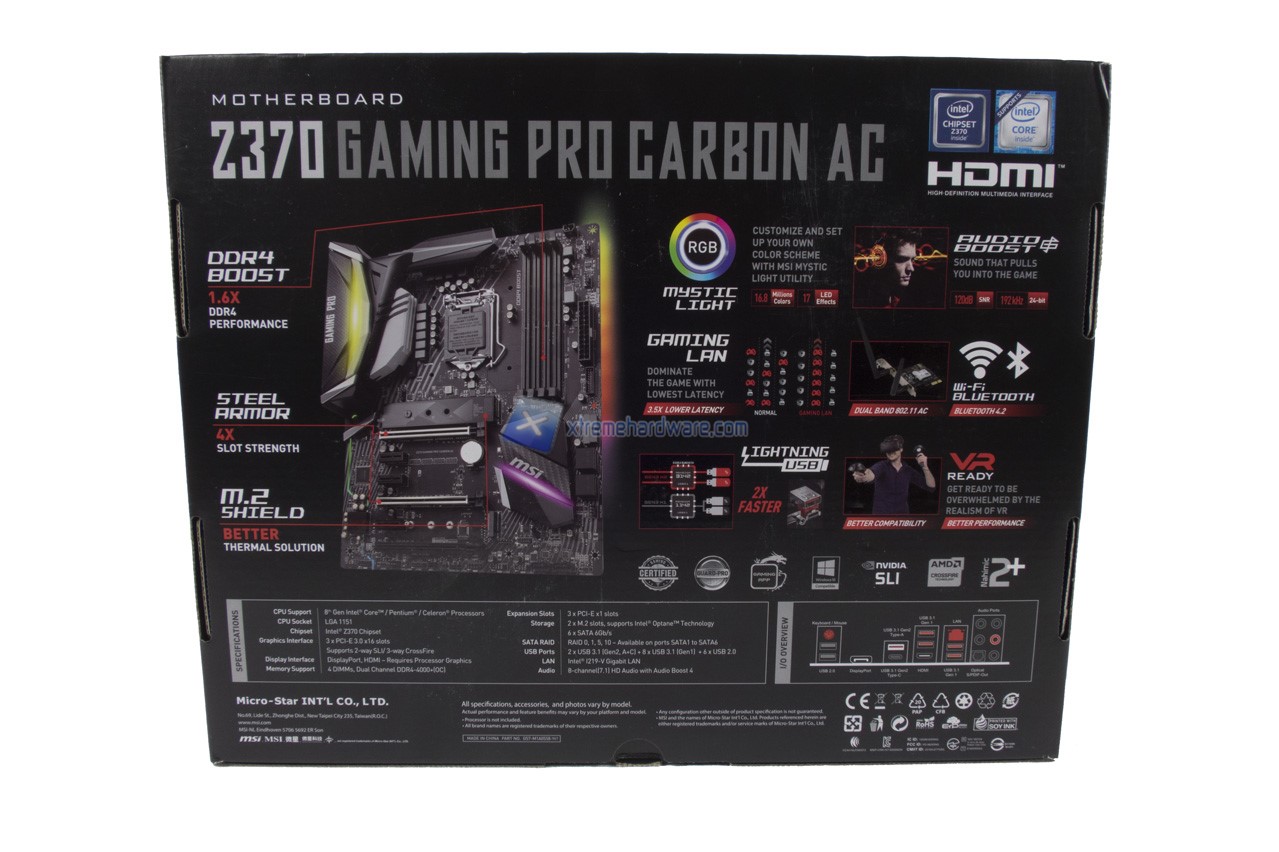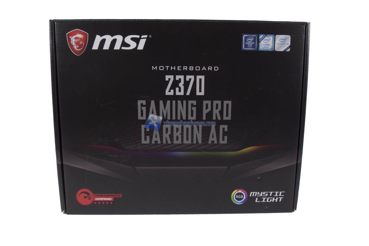 La MSI Z370 Gaming Pro Carbon AC come ogni altra scheda madre ci giunge in una confezione di cartone di forma rettangolare. La grafica e colorazione è tendente al nero anche per mantenere una migliore affinità al ‘’Carbon’’ inerente il modello stesso. Vengono riportate tutte le principali caratteristiche, specifiche e informazioni circa il modello.