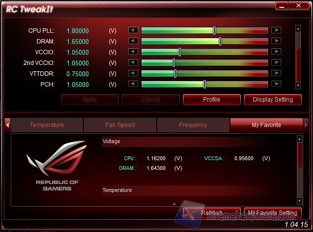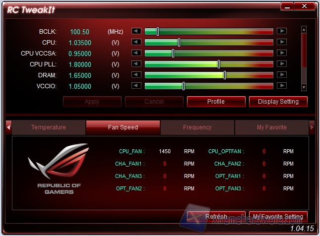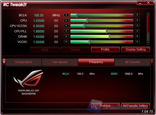 Altrettanto conosciuta per gli utilizzatori di schede ROG è l’utility RC TweakIt con cui è possibile interagire da un altro computer, per esempio un portatile collegato alla scheda tramite la tecnologia proprietaria ROG Connect utilizzando il cavo bianco USB fornito in dotazione. La comodità di utilizzo è estrema, dato che è come se si avesse un secondo schermo con cui visualizzare ed applicare le modifiche, mentre con lo schermo principale si fanno girare i benchmark oppure i giochi a schermo intero. Il tool è preciso e le modifiche vengono applicate in tempo reale.