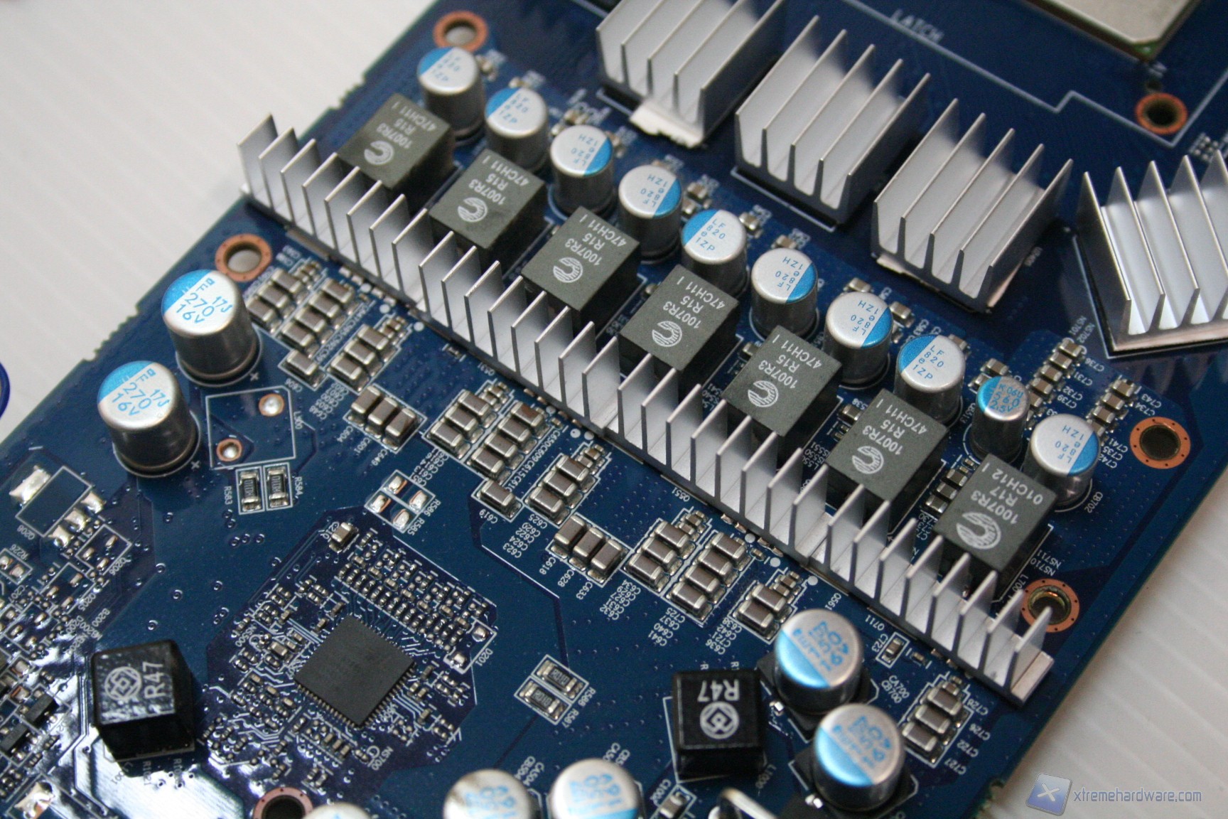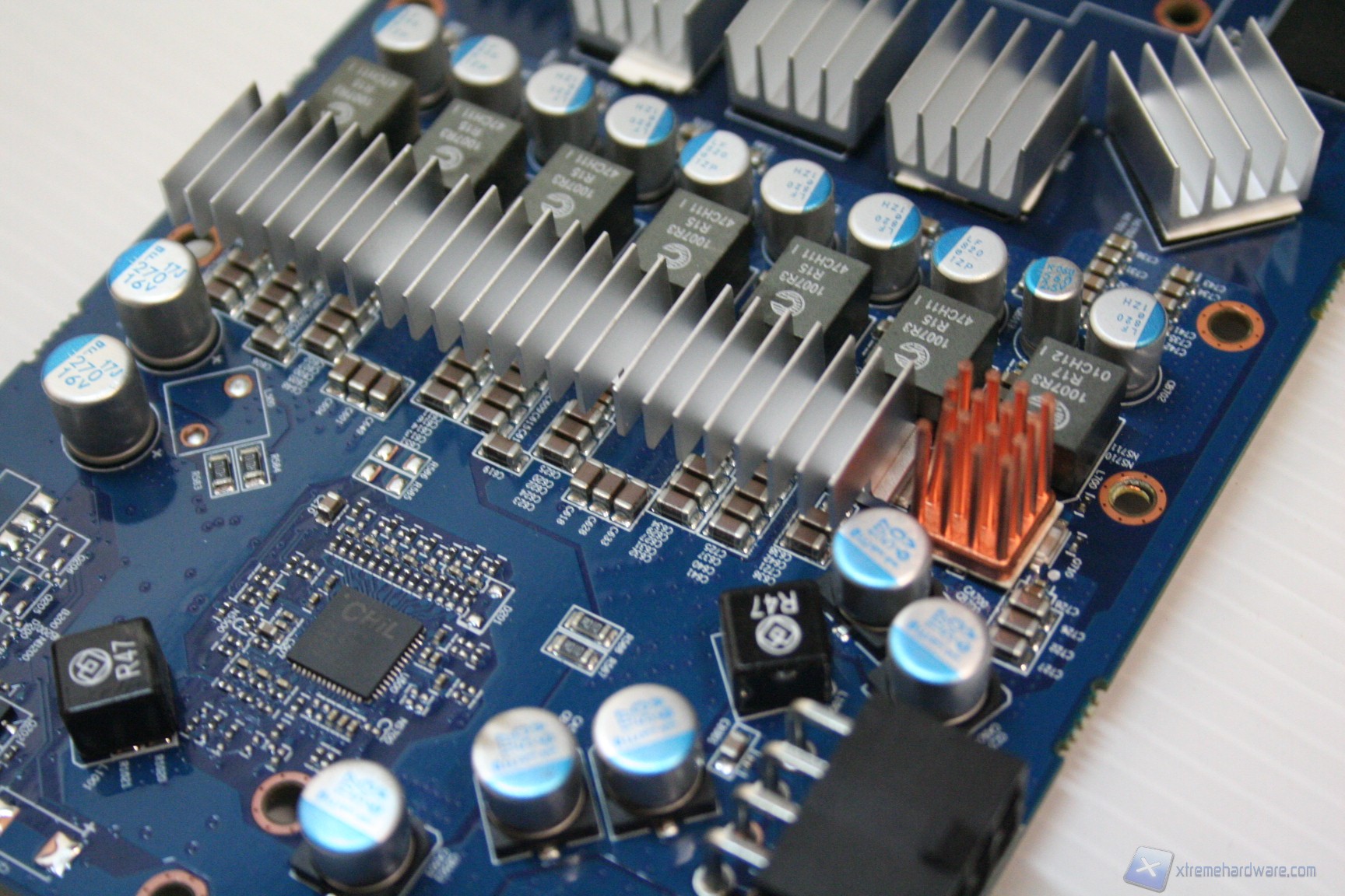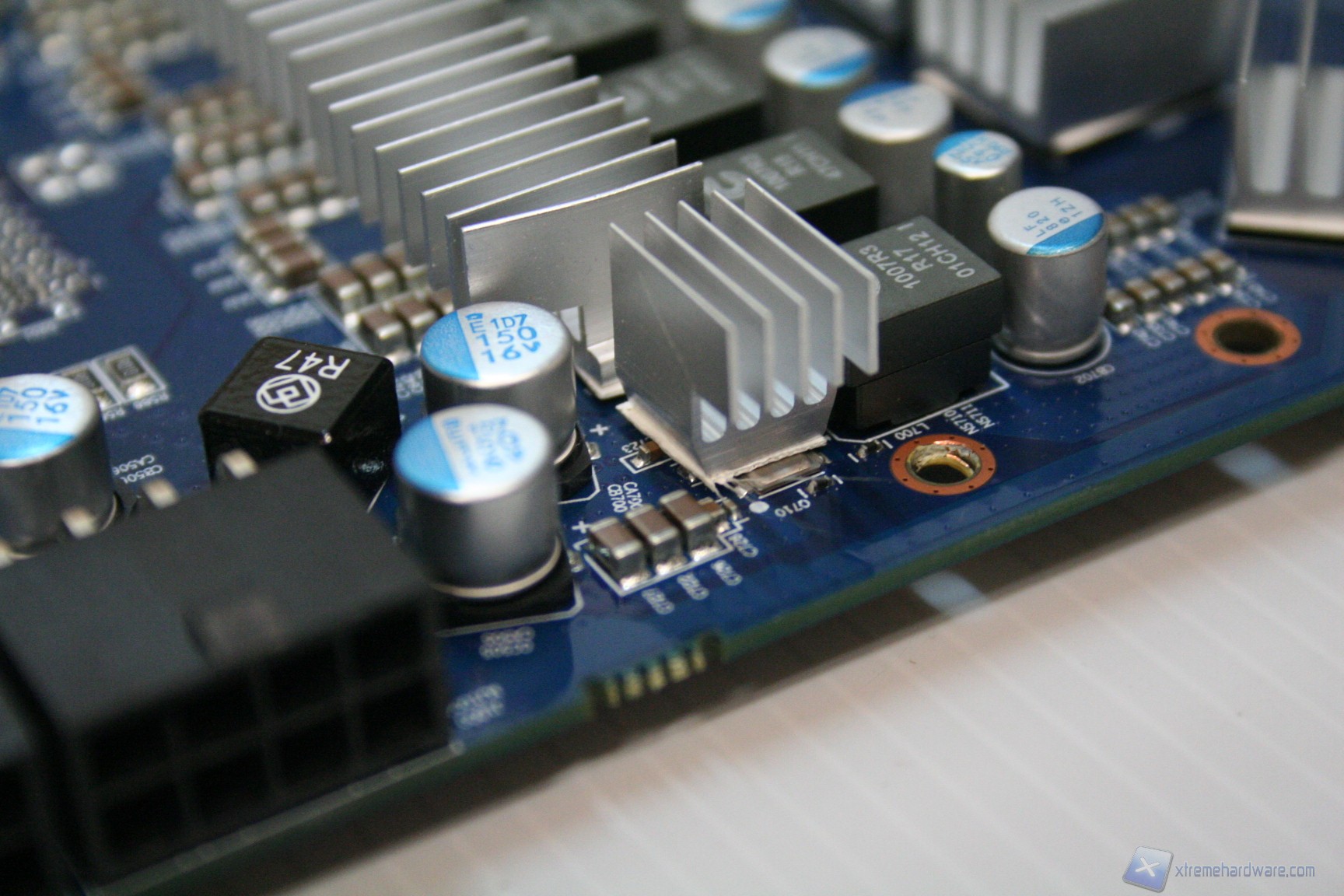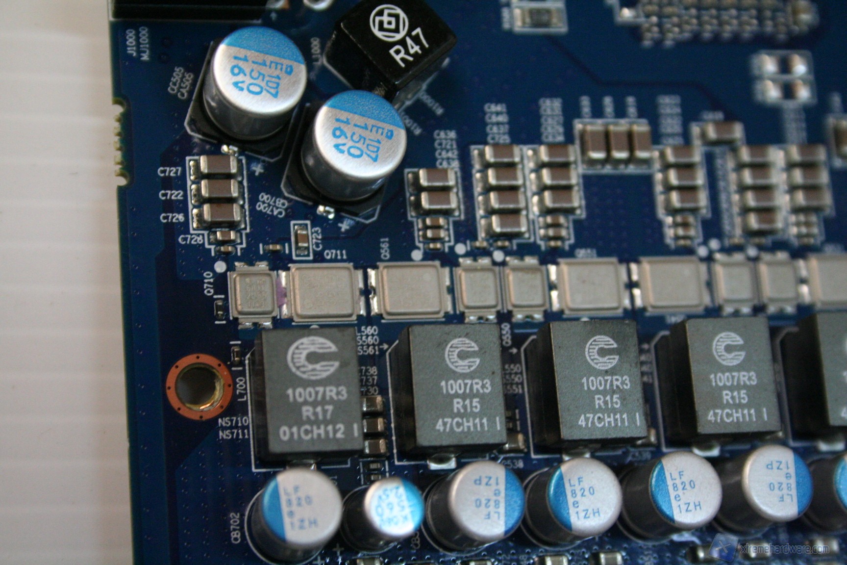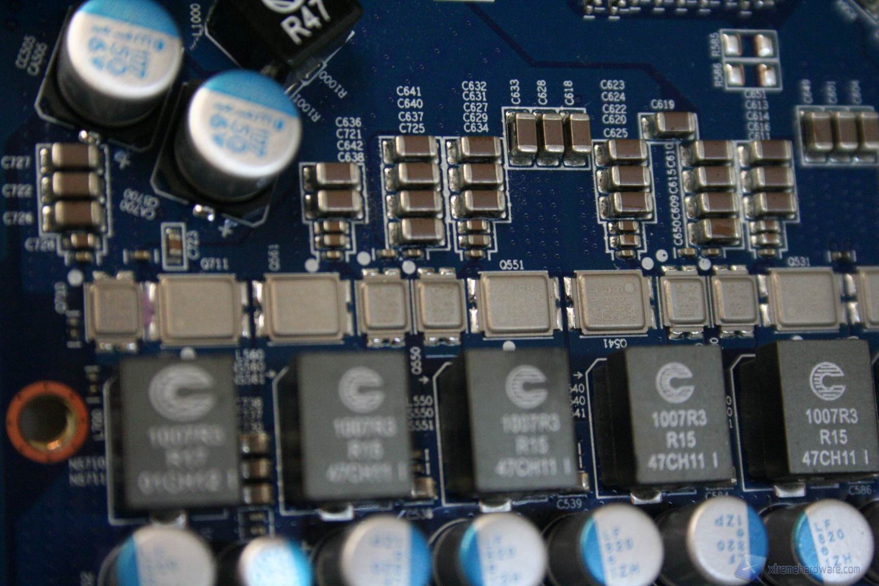 Come si vede dalle foto qui sotto, la scheda Gigabyte invece presenta una piccola placca dissipante, che viene raffreddata meglio da una ventola da 80mm, a grandi RPM, posta esattamente sopra i VRM.