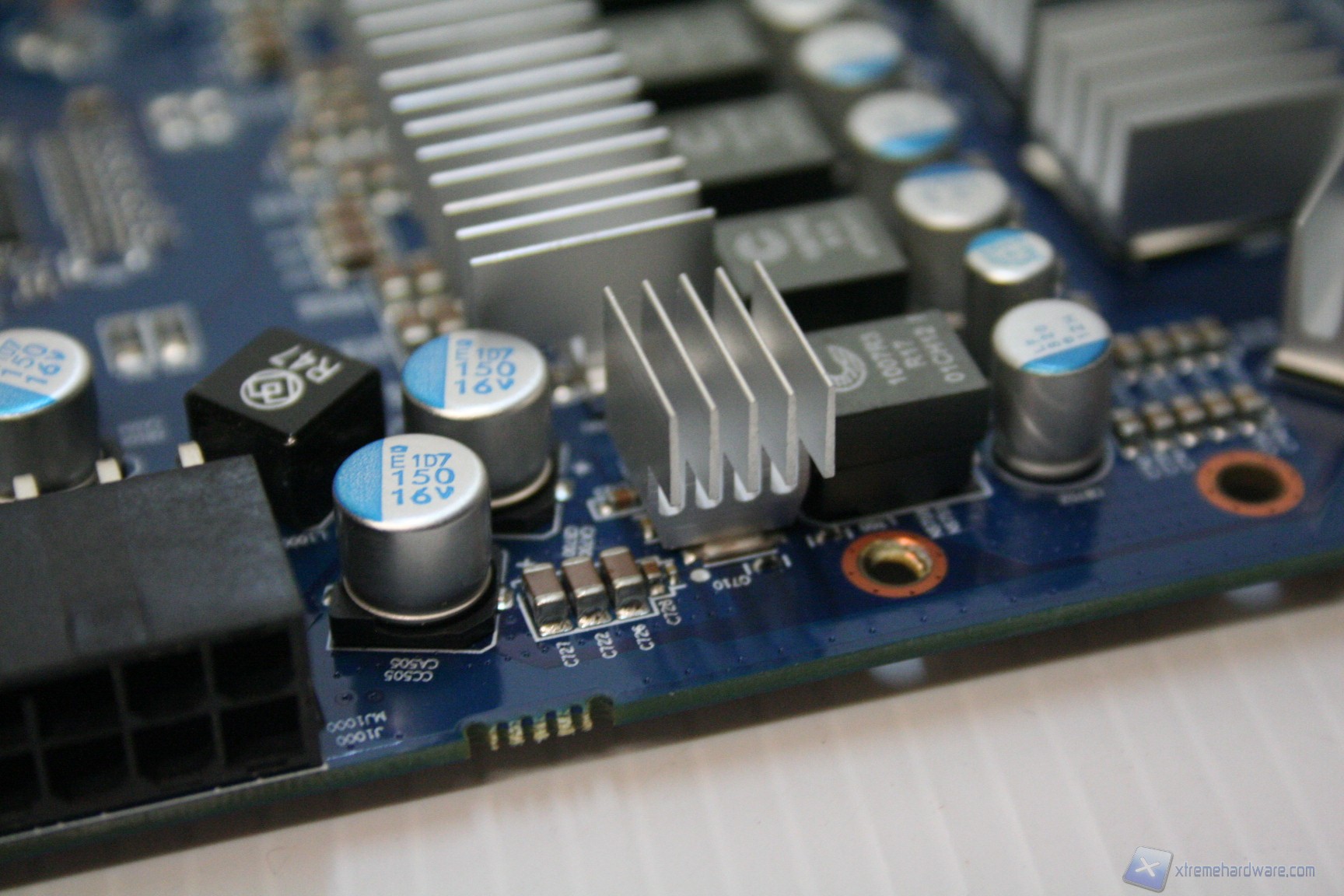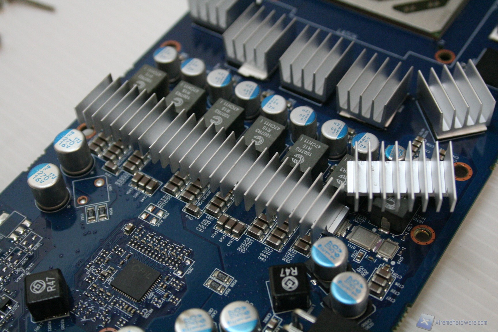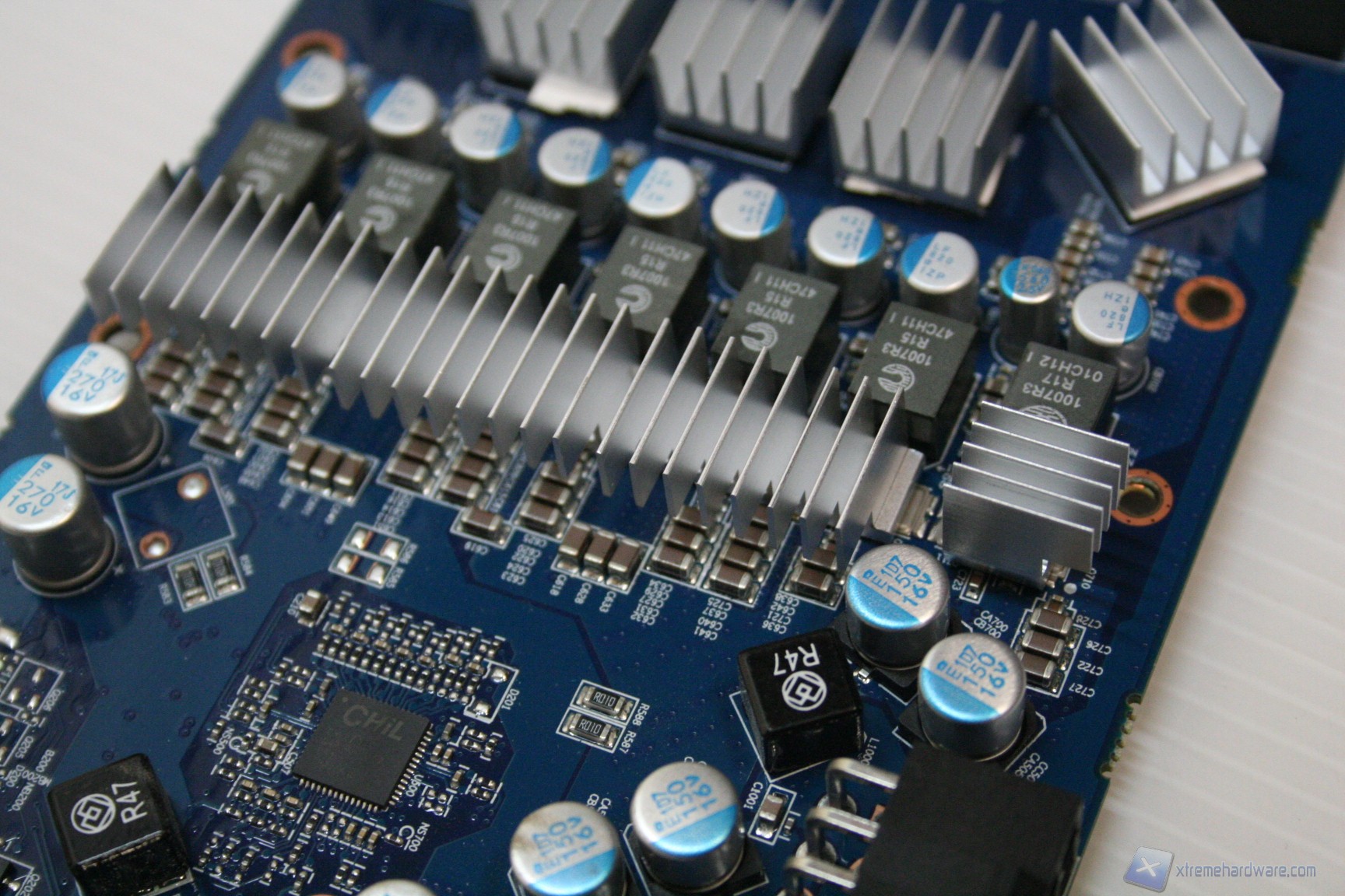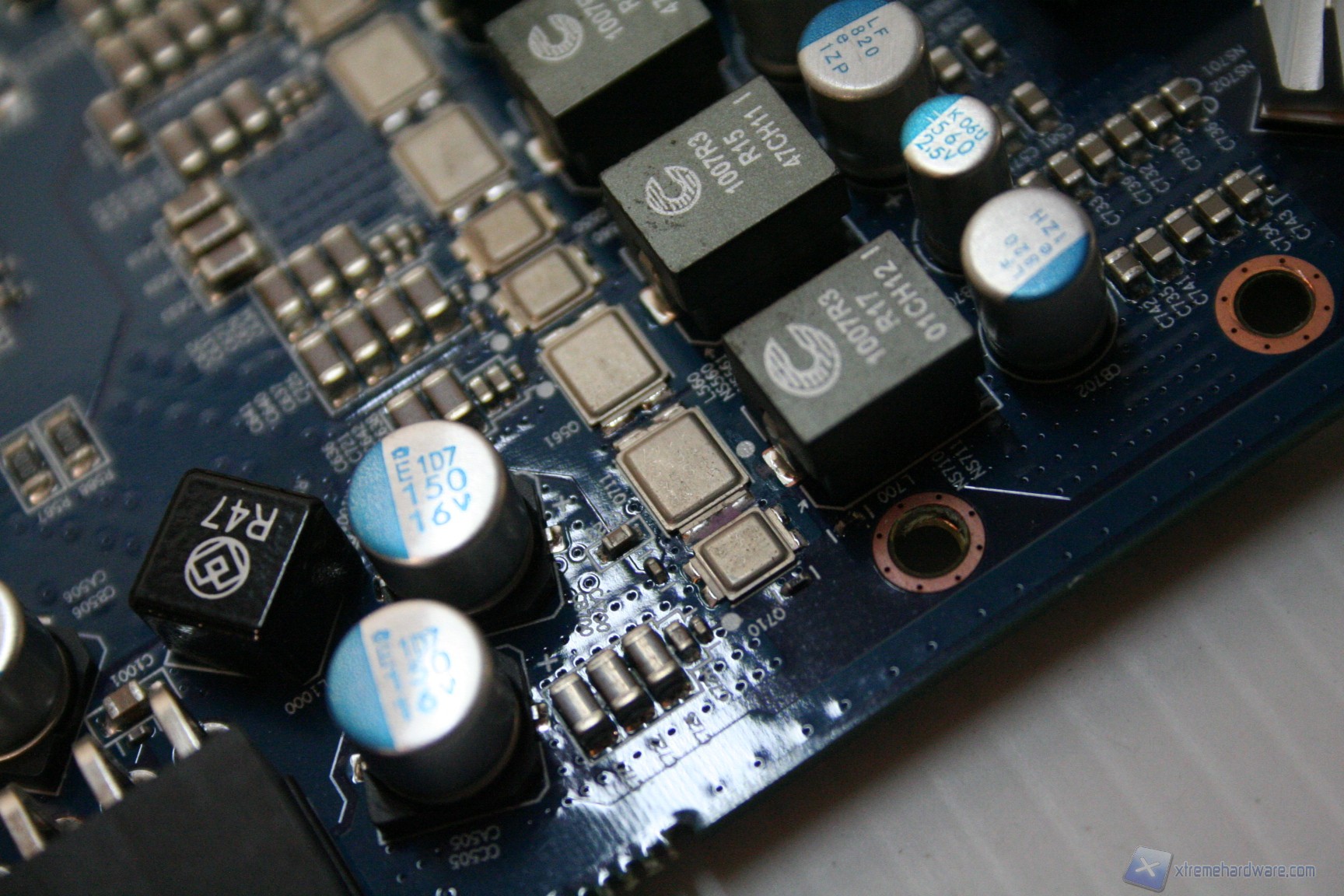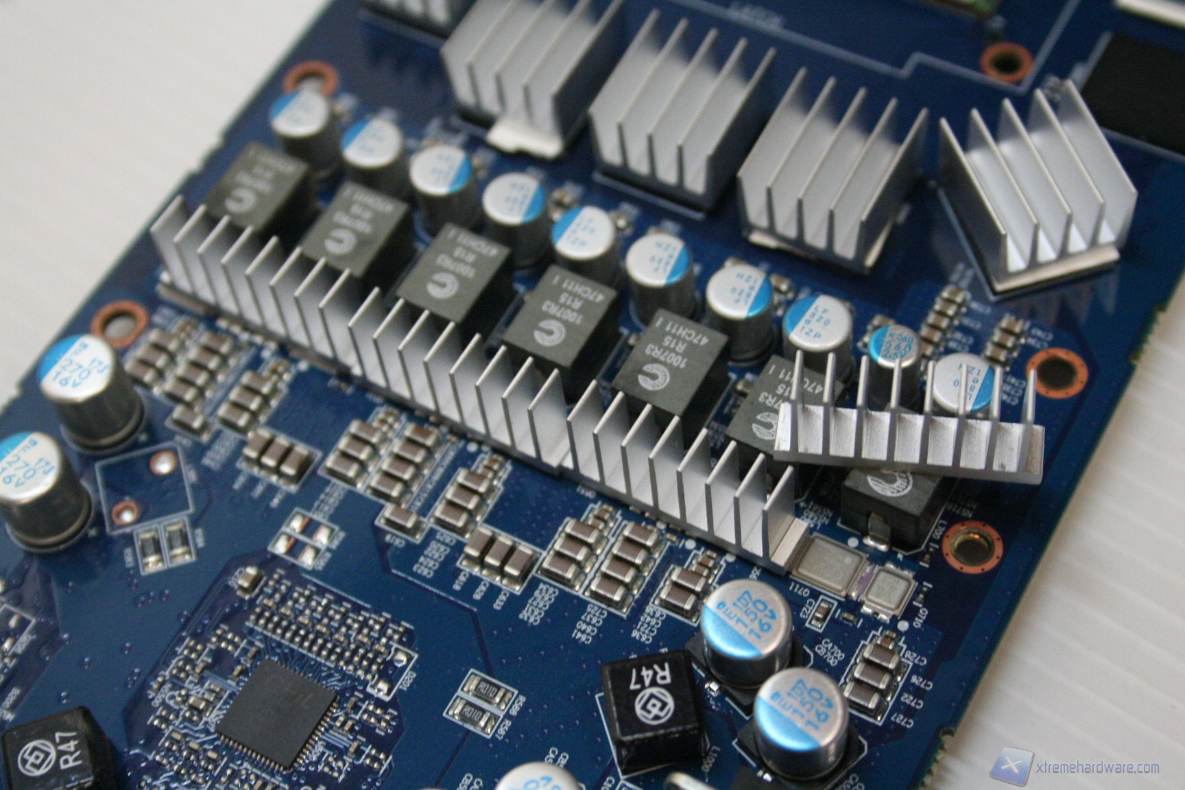 Come si vede dalle foto qui sotto, la scheda Gigabyte invece presenta una piccola placca dissipante, che viene raffreddata meglio da una ventola da 80mm, a grandi RPM, posta esattamente sopra i VRM.