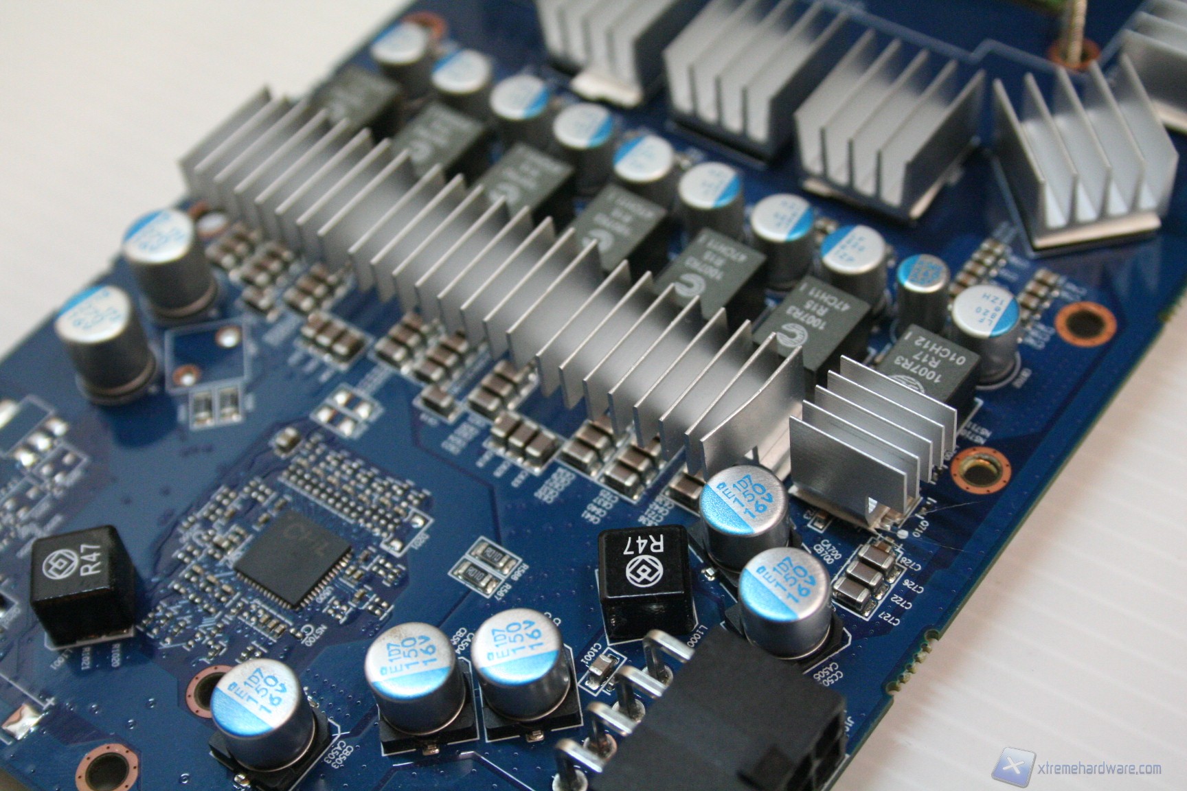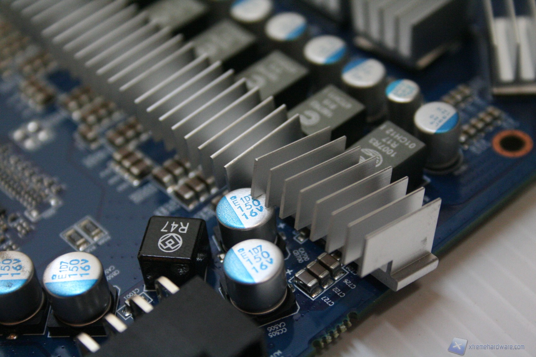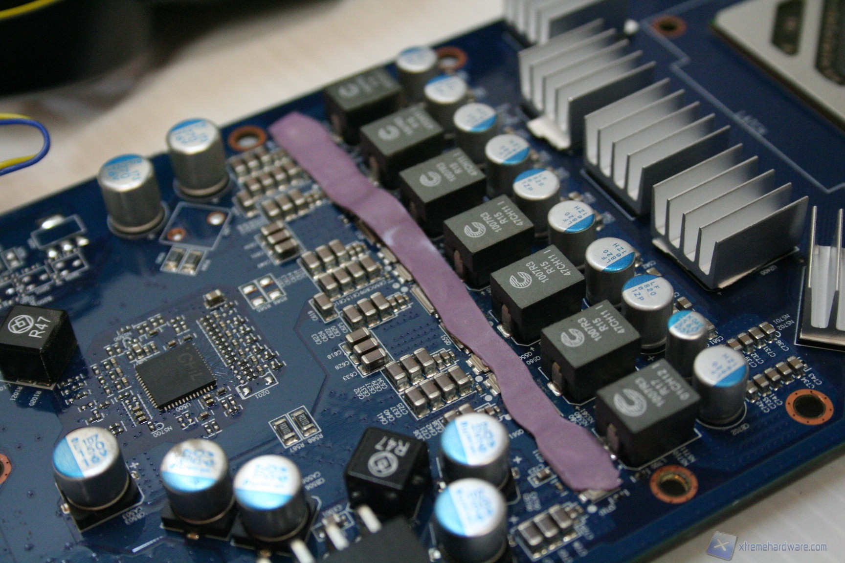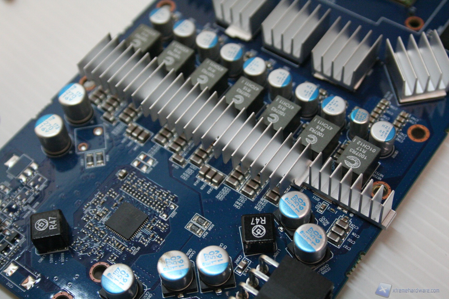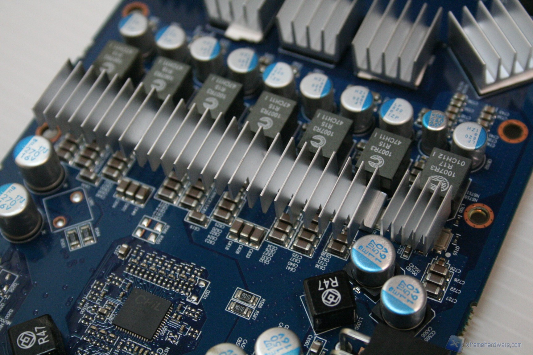 Come si vede dalle foto qui sotto, la scheda Gigabyte invece presenta una piccola placca dissipante, che viene raffreddata meglio da una ventola da 80mm, a grandi RPM, posta esattamente sopra i VRM.