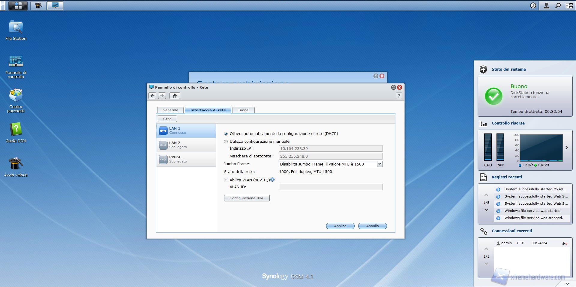 Nel menù "rete", il sistema ci permette di configurare i parametri relativi alla connessione del Synology DS412+ all'interno della rete interna, stabilendone il nome del server, eventuali proxy, modalità di ottenimento dell'indirizzo IP per ogni interfaccia RJ-45 (se in modalità manuale o DHCP) e abilitazione di tunneling tra protocollo Ipv4 ed Ipv6.