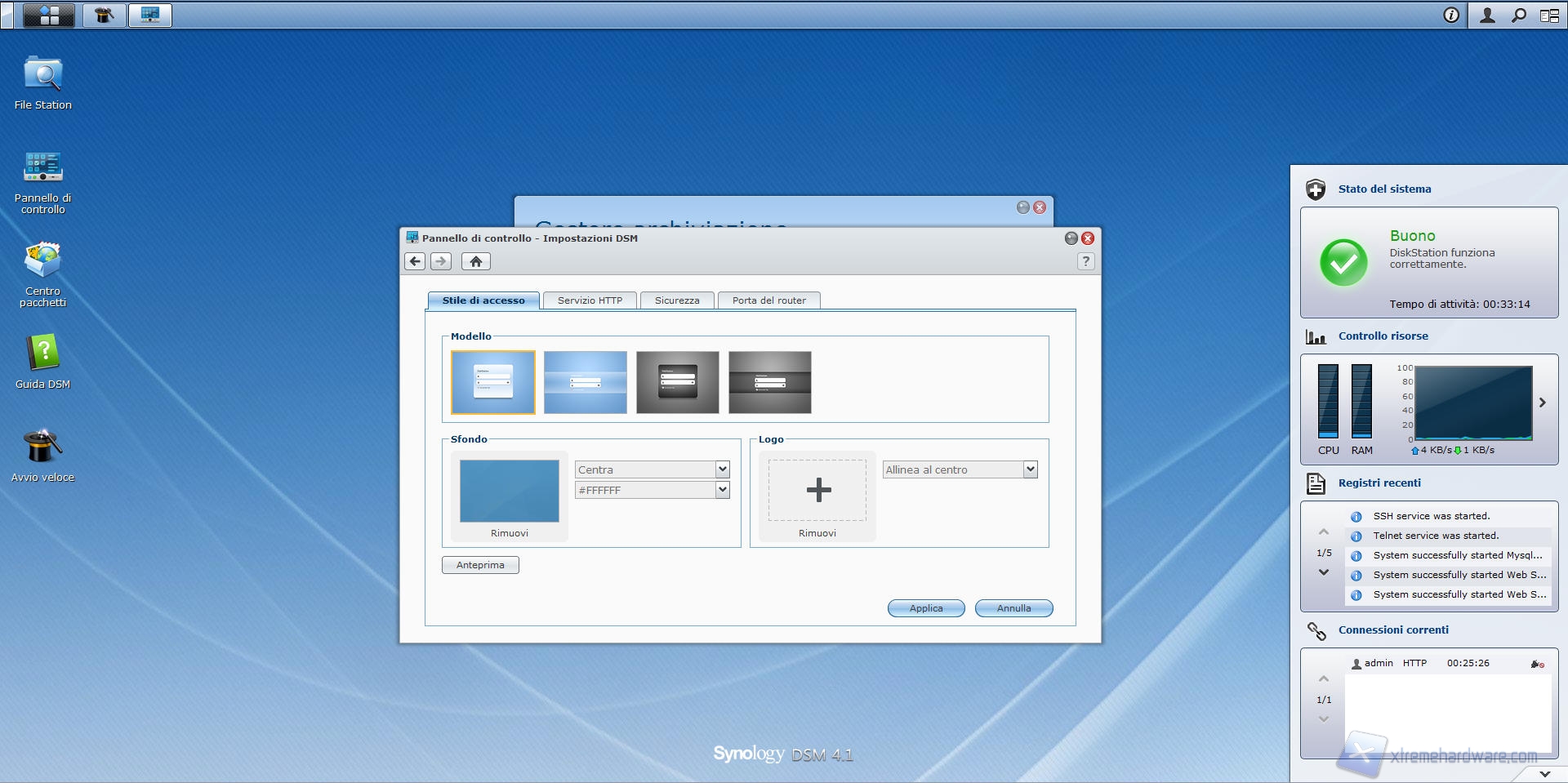 Tramite i menù facenti parte di questa voce abbiamo la possibilità di scegliere lo sfondo del desktop ed il "tema" del DSM, la porta di accesso al DSM tramite protocollo HTTP/HTTPS, timeout di disconnessione automatica dal browser DSM ed infine di impostare parametri di accesso da parte di applicazioni e servizi Internet che hanno libertà di accesso al sistema.