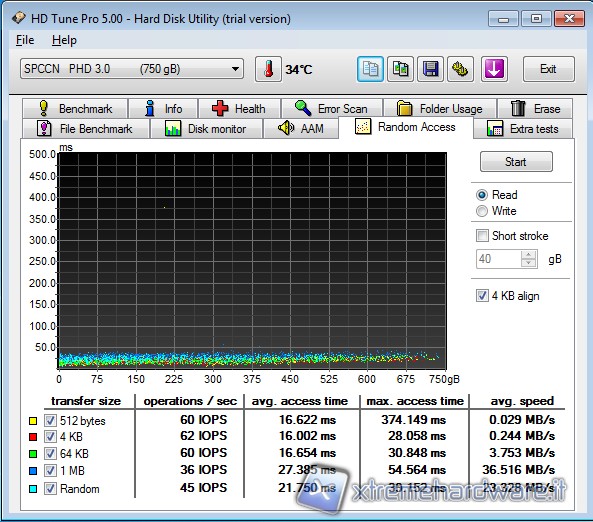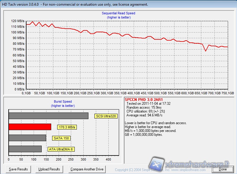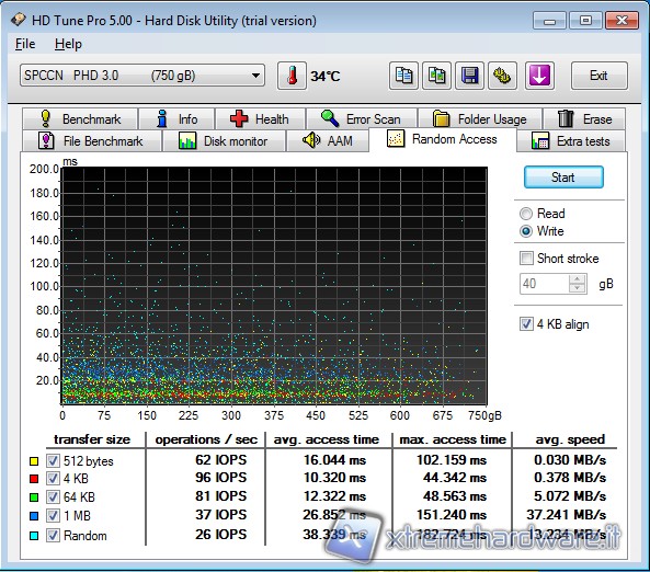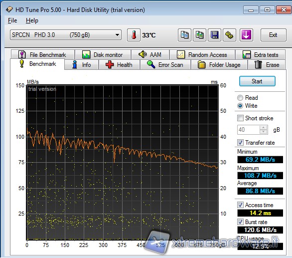 I valori ottenuti relativi al benchmark sia in lettura sia in scrittura dimostrano le ottime prestazioni del disco, che si attestano in entrambi i casi attorno ai 90 MB/s. Nella media degli HD 2,5” gli access time, che risultano attorno ai 15 ms.