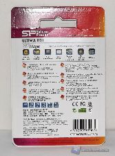 Sul cartoncino, con sfondo dalla prevalenza grigio chiaro, sono riportate le informazioni generali del prodotto: abbiamo infatti in evidenza la capacità della memoria (4 GB nel caso del nostro esemplare)  ed il modello,  ULTIMA U01, oltre al logo dell'azienda. Più in basso troviamo riportate alcune caratteristiche del prodotto: la compatibilità con Windows 7, la fornitura del software "SP Widget", la modalità Slide to use e la presenza della garanzia a vita.