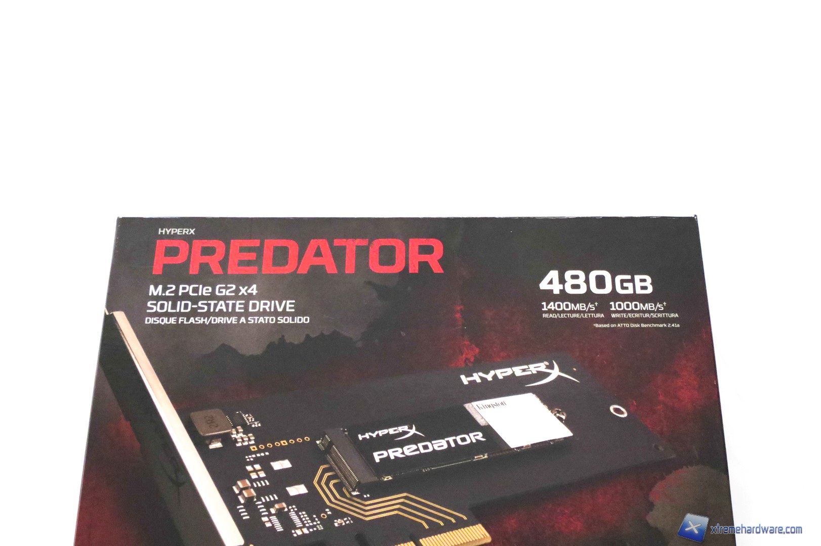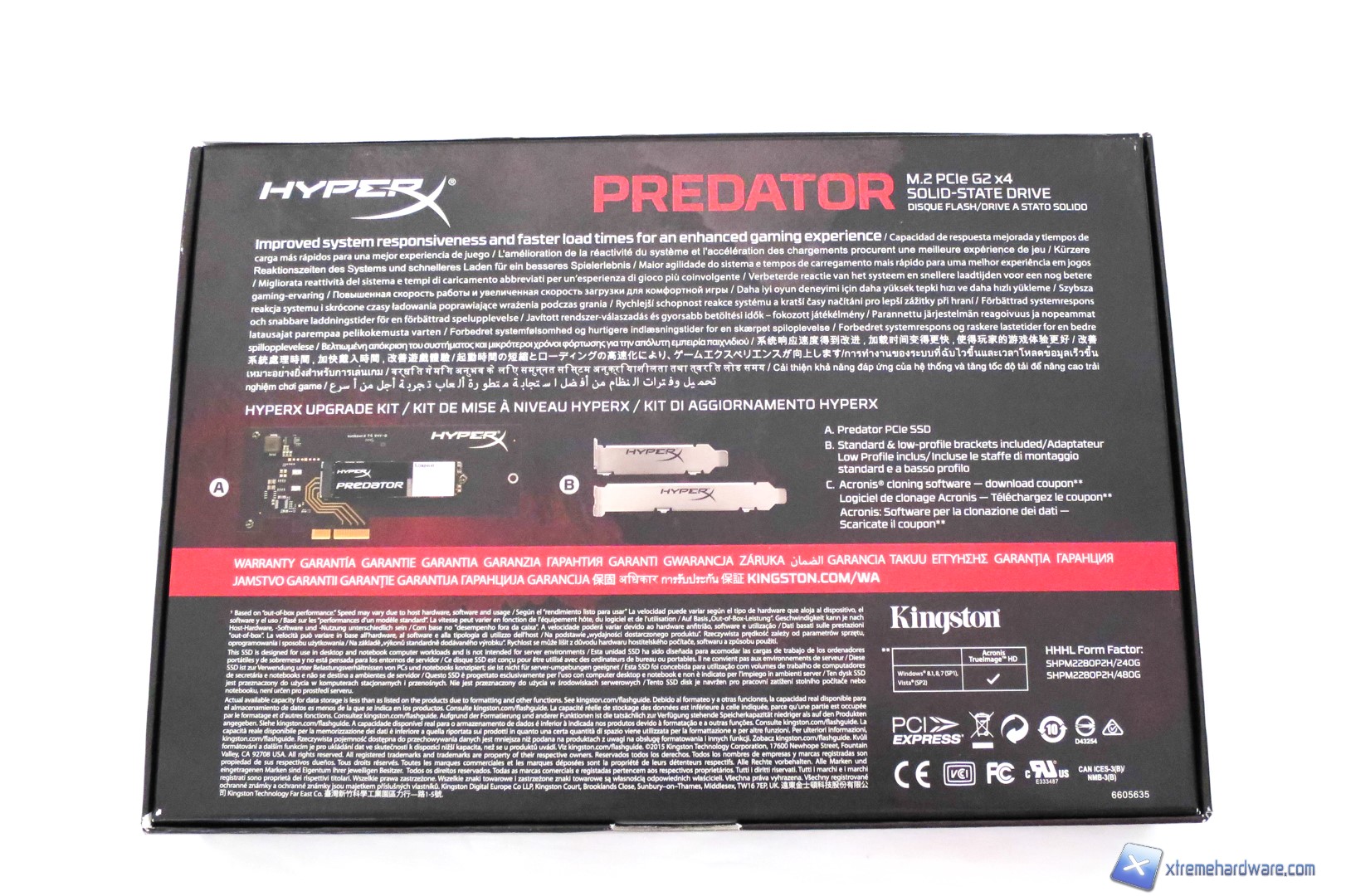 Il Kingston HyperX Predator ci giunge in un cofanetto di cartone con la classica grafica illustrativa dei prodotti HyperX. Nella parte frontale della confezione trovano posto l’immagine illustrativa del drive, il modello, la capacità ed altri informazioni relative al drive.