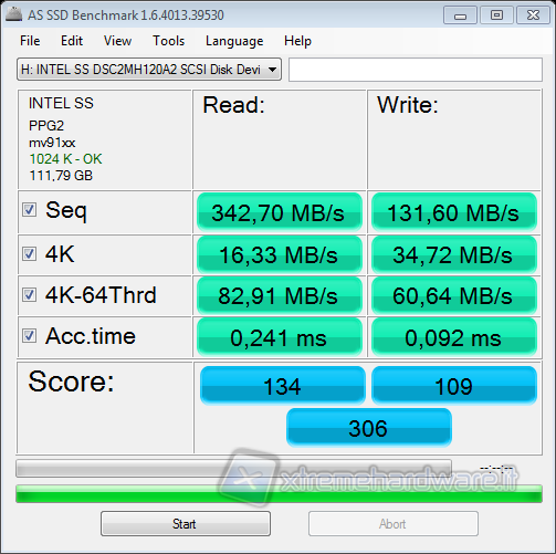 AS SSD Benchmark, un altro strumento di test gratuito, studiato appositamente per effettuare benchmarks sugli SSD, effettua i suoi test sintetici senza adoperare la cache del sistema operativo (cosa che influenza parecchio i risultati del Transfer Rate), oltre a questo determina i tempi di accesso al disco sfruttando l’intera capacità del disco stesso, ulteriore peculiarità di questo benchmark è che i test vengono effettuati adoperando dati non comprimibili.